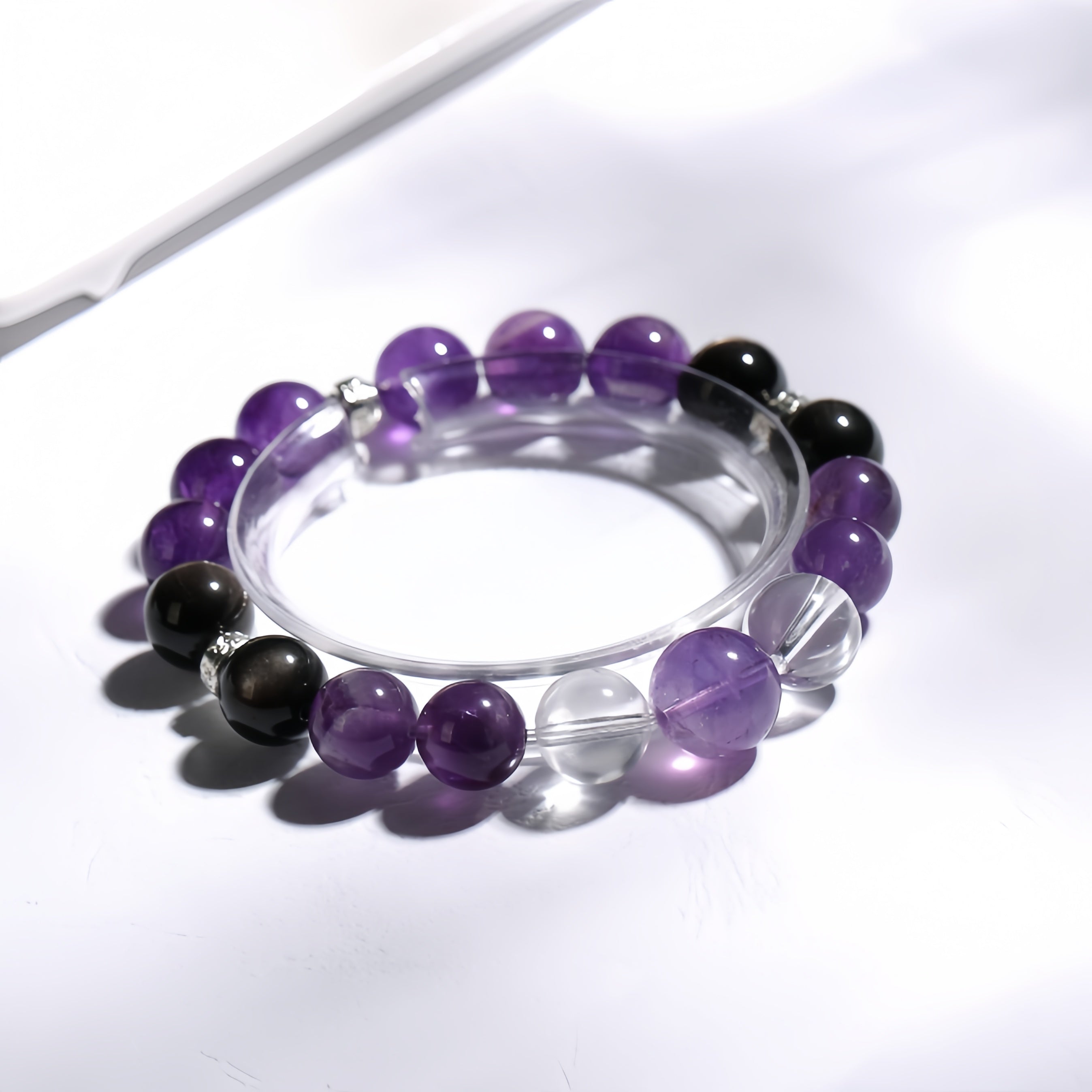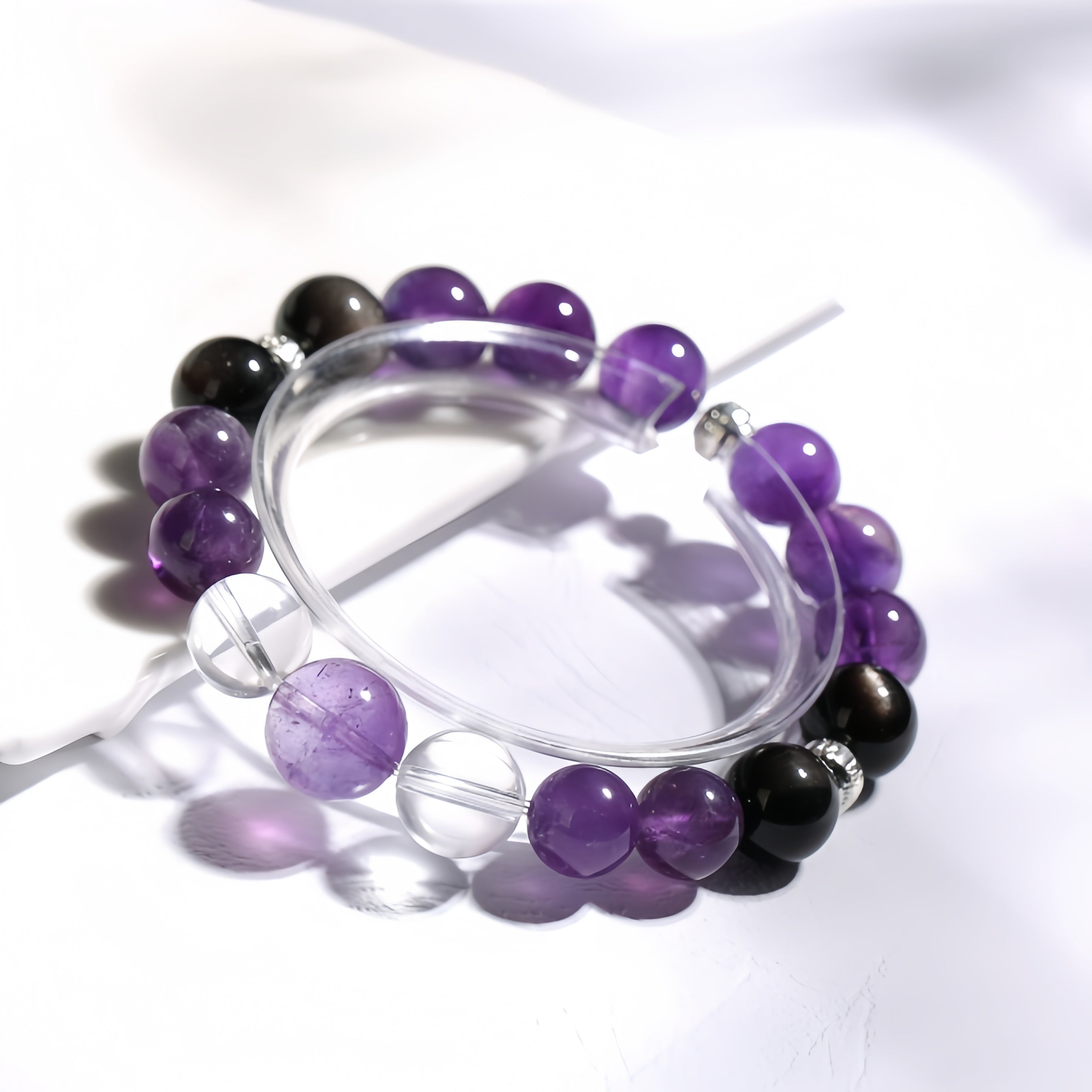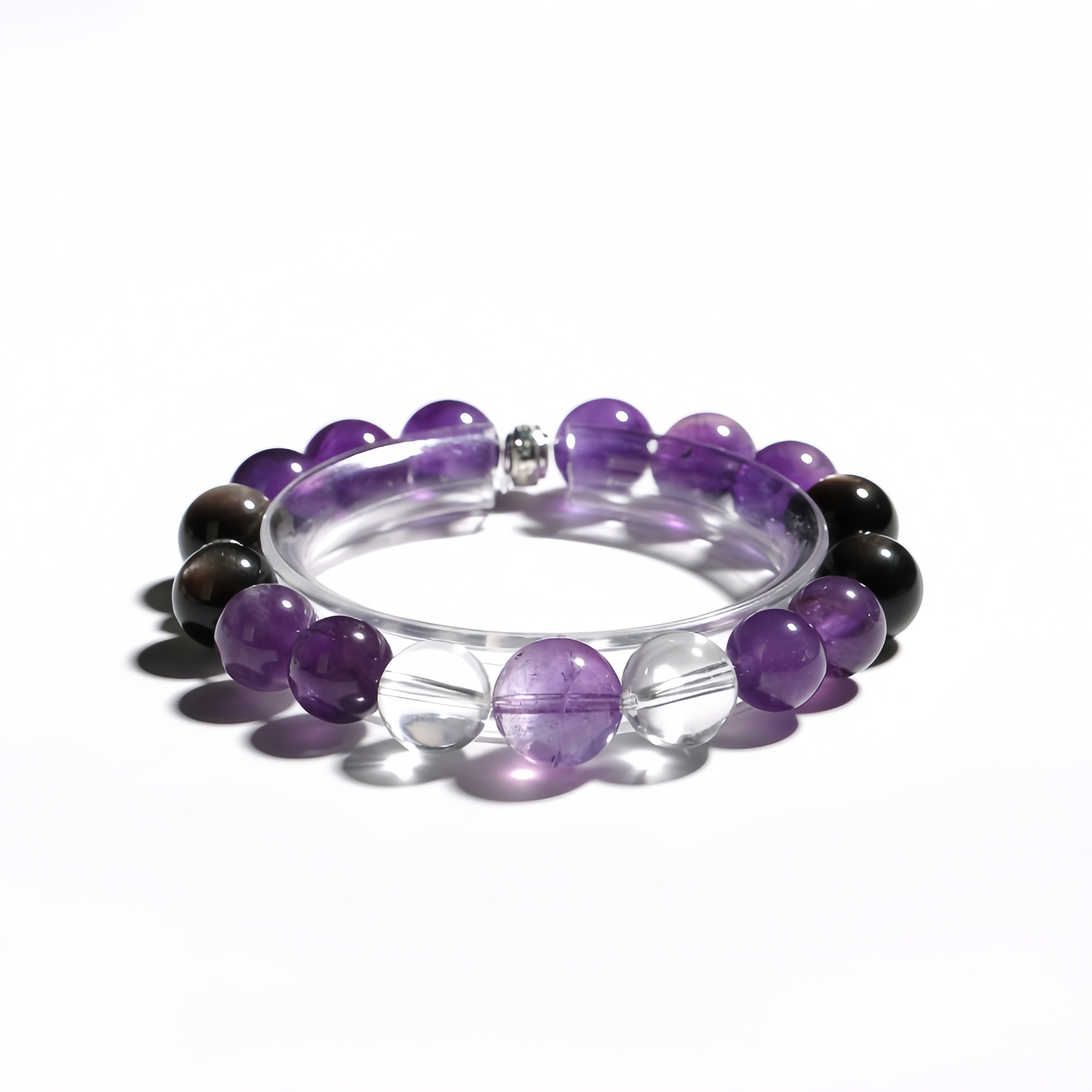 This bracelet is beautifully crafted with Amethyst, Obsidian, and Clear Quartz, offering a harmonious balance of energy and beauty. Amethyst carries powerful spiritual energy, enhancing inner wisdom and self-awareness, while helping to relieve stress and anxiety, bringing emotional balance. Obsidian provides strong energy protection, dispelling negative emotions and boosting confidence and inner strength. Clear Quartz has purifying and amplifying properties, clearing negative energy and bringing clarity and tranquility to the body and mind. Wearing this bracelet, you will experience spiritual elevation and energy balance, guarding your body and energy.