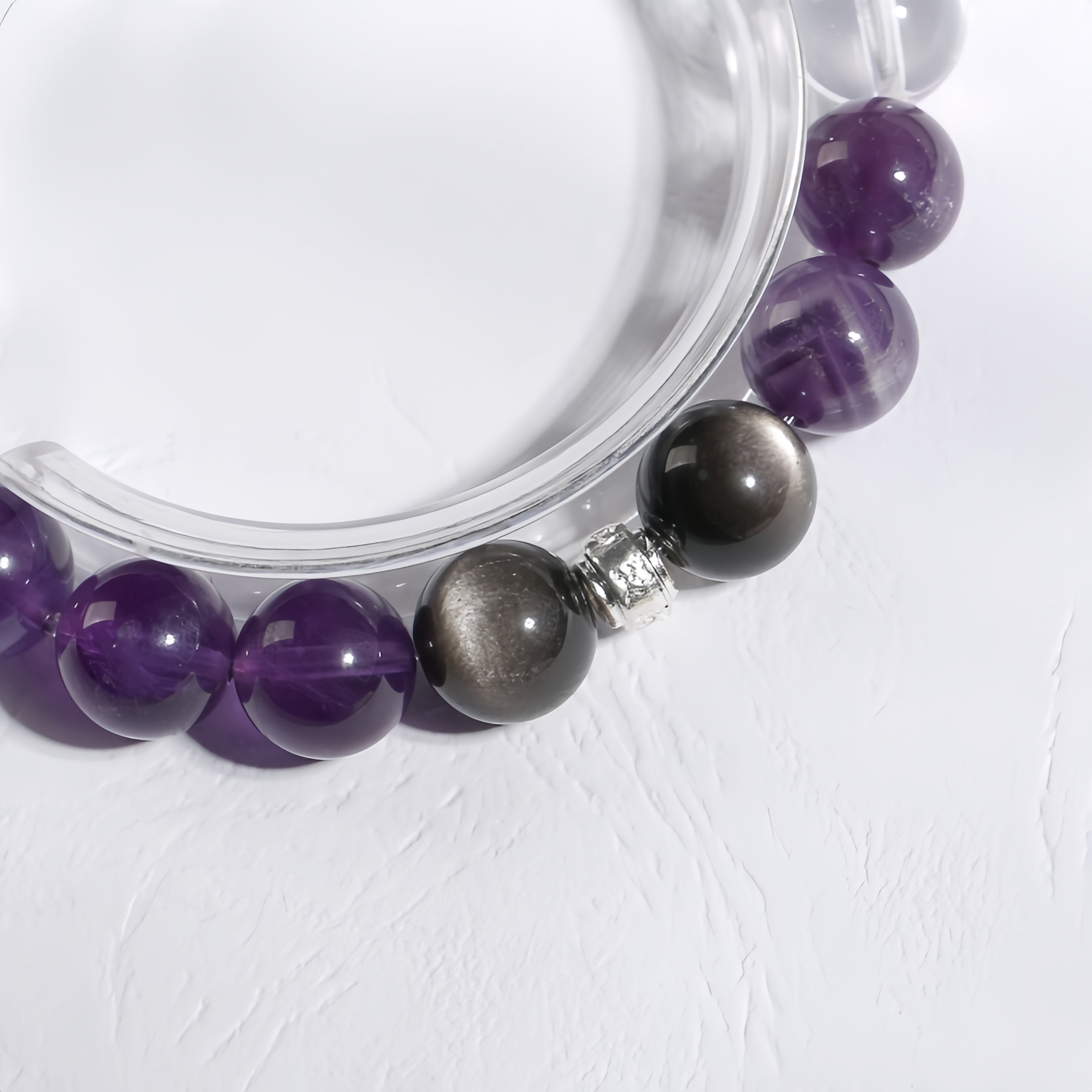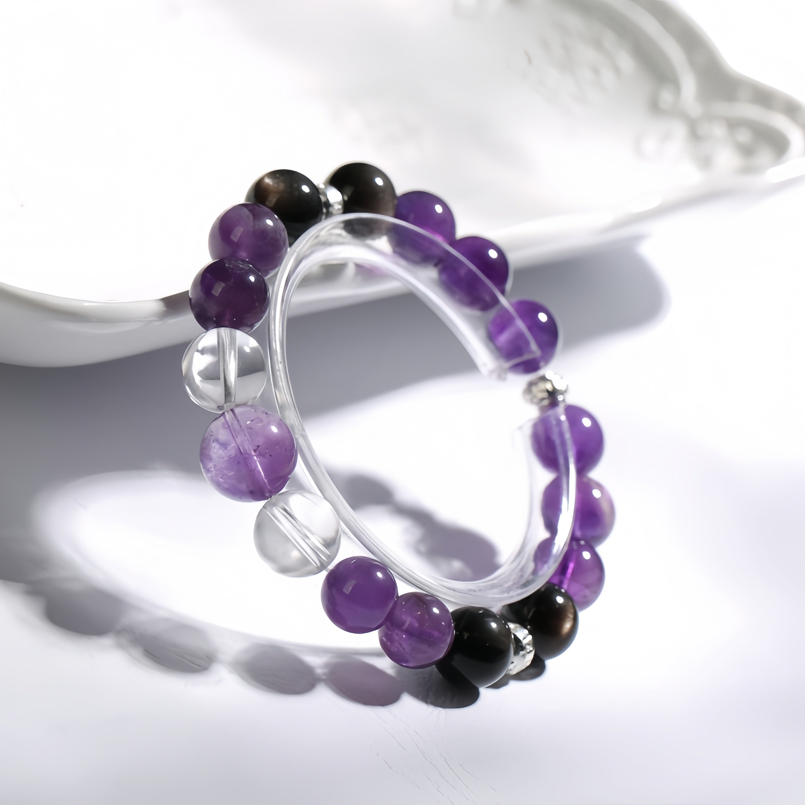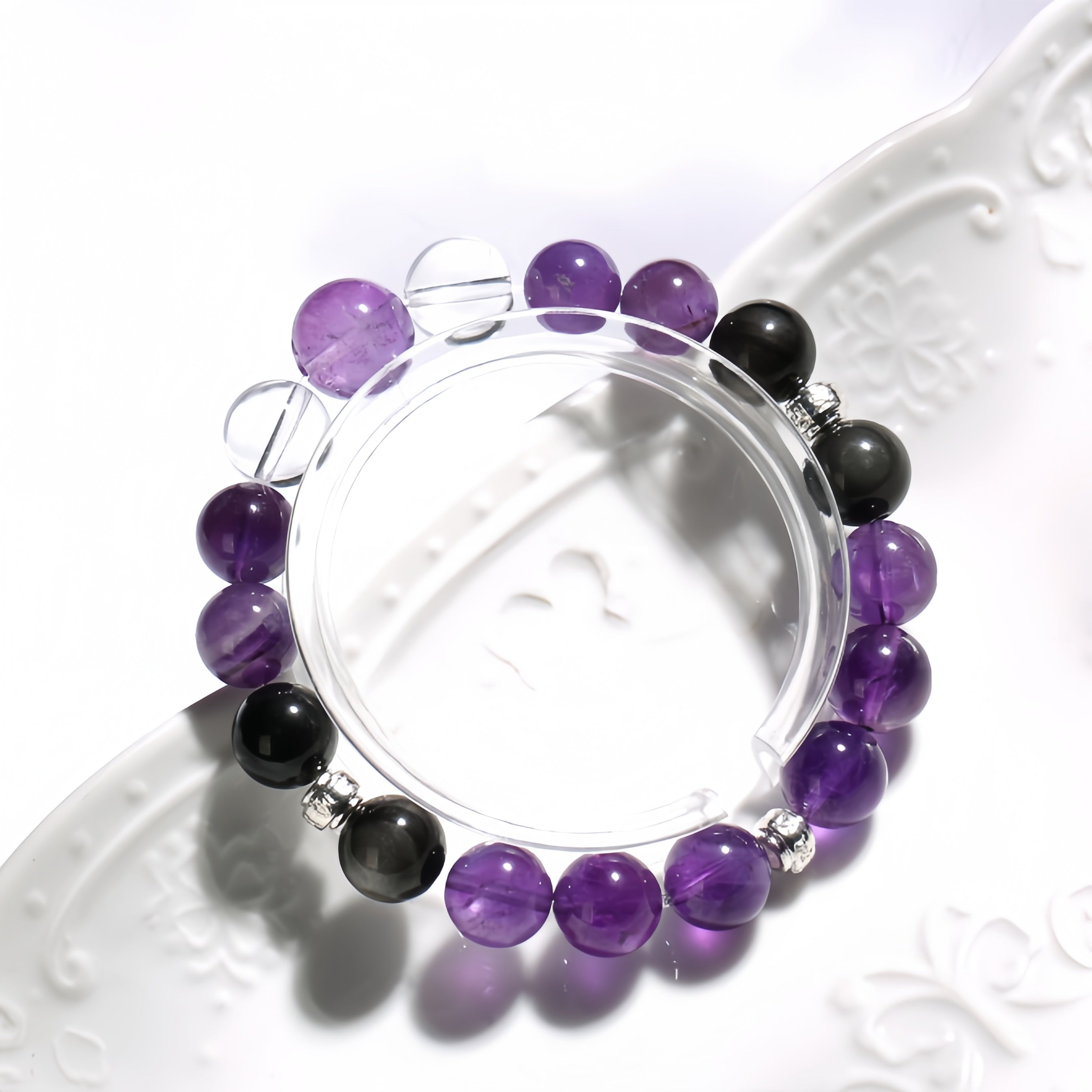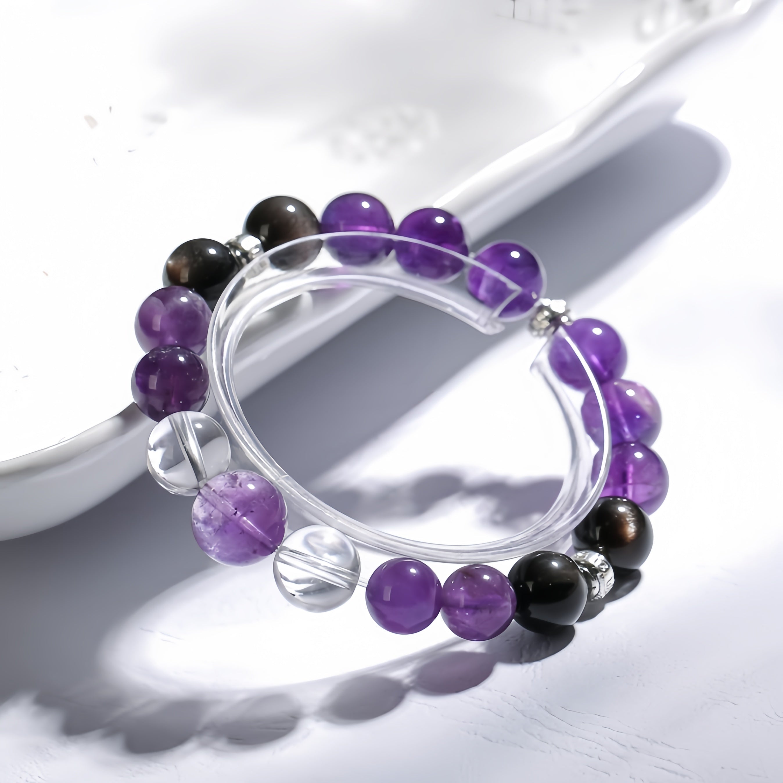 This bracelet is beautifully crafted with Amethyst, Obsidian, and Clear Quartz, offering a harmonious balance of energy and beauty. Amethyst carries powerful spiritual energy, enhancing inner wisdom and self-awareness, while helping to relieve stress and anxiety, bringing emotional balance. Obsidian provides strong energy protection, dispelling negative emotions and boosting confidence and inner strength. Clear Quartz has purifying and amplifying properties, clearing negative energy and bringing clarity and tranquility to the body and mind. Wearing this bracelet, you will experience spiritual elevation and energy balance, guarding your body and energy.
