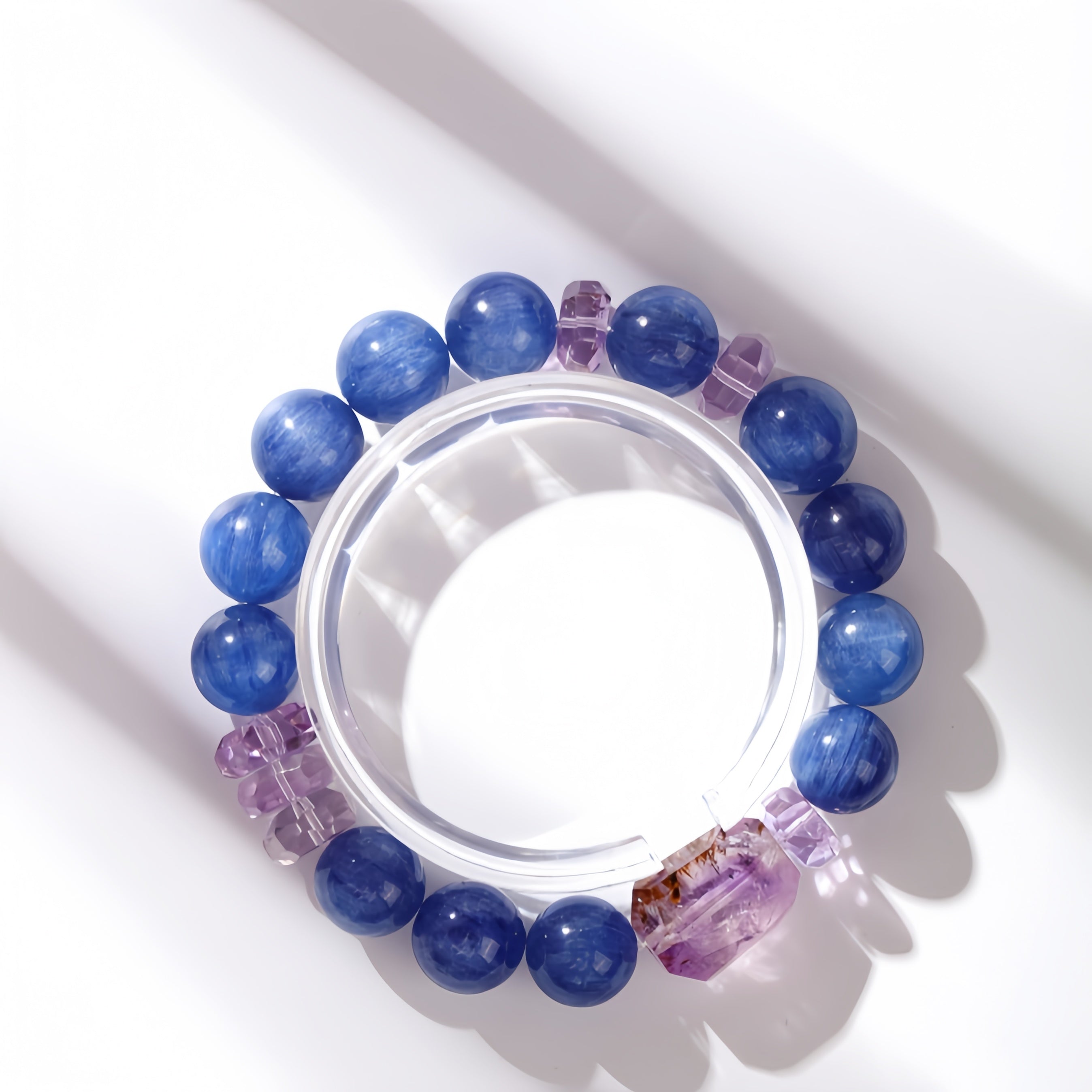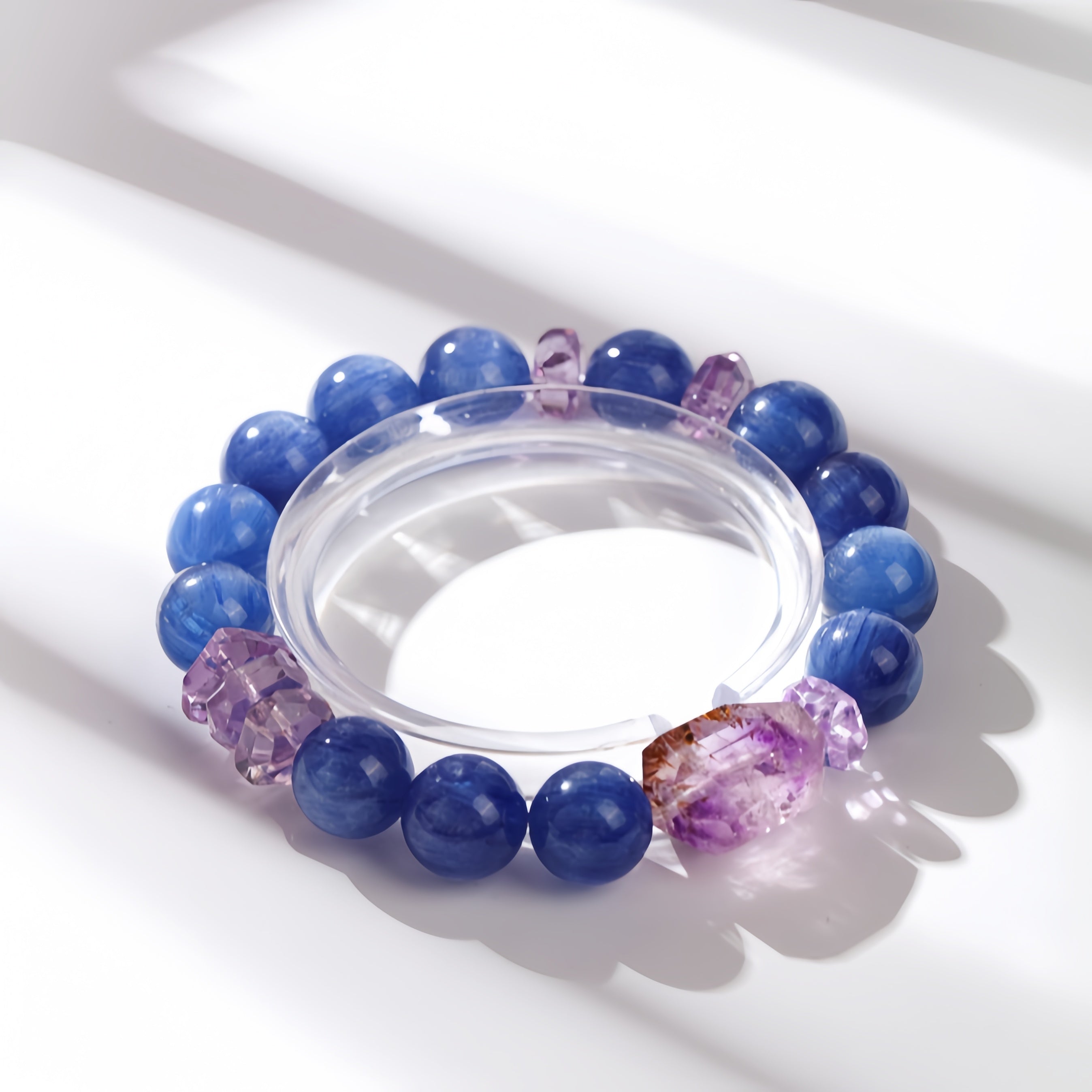 This bracelet blends deep blue Kyanite with radiant Amethyst,