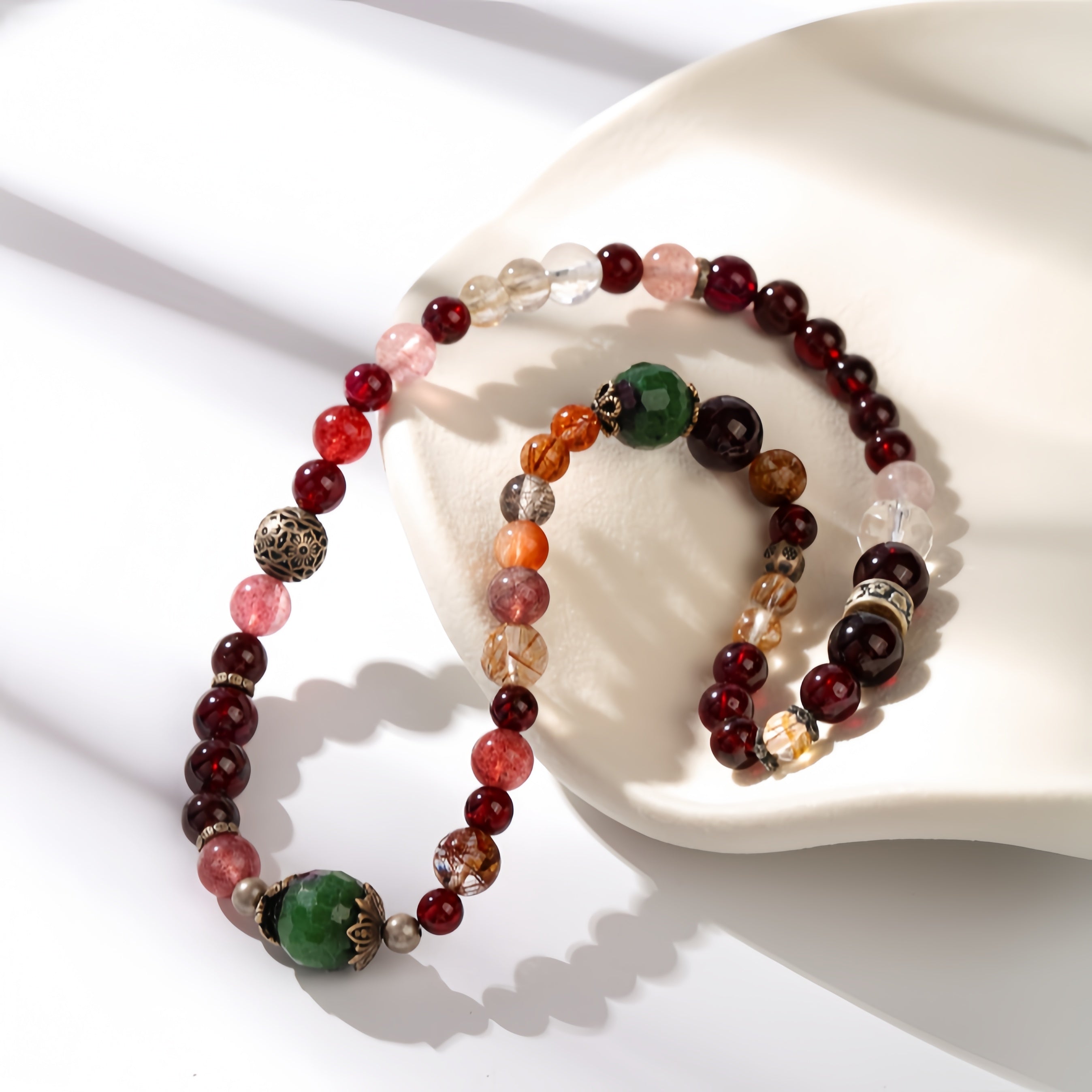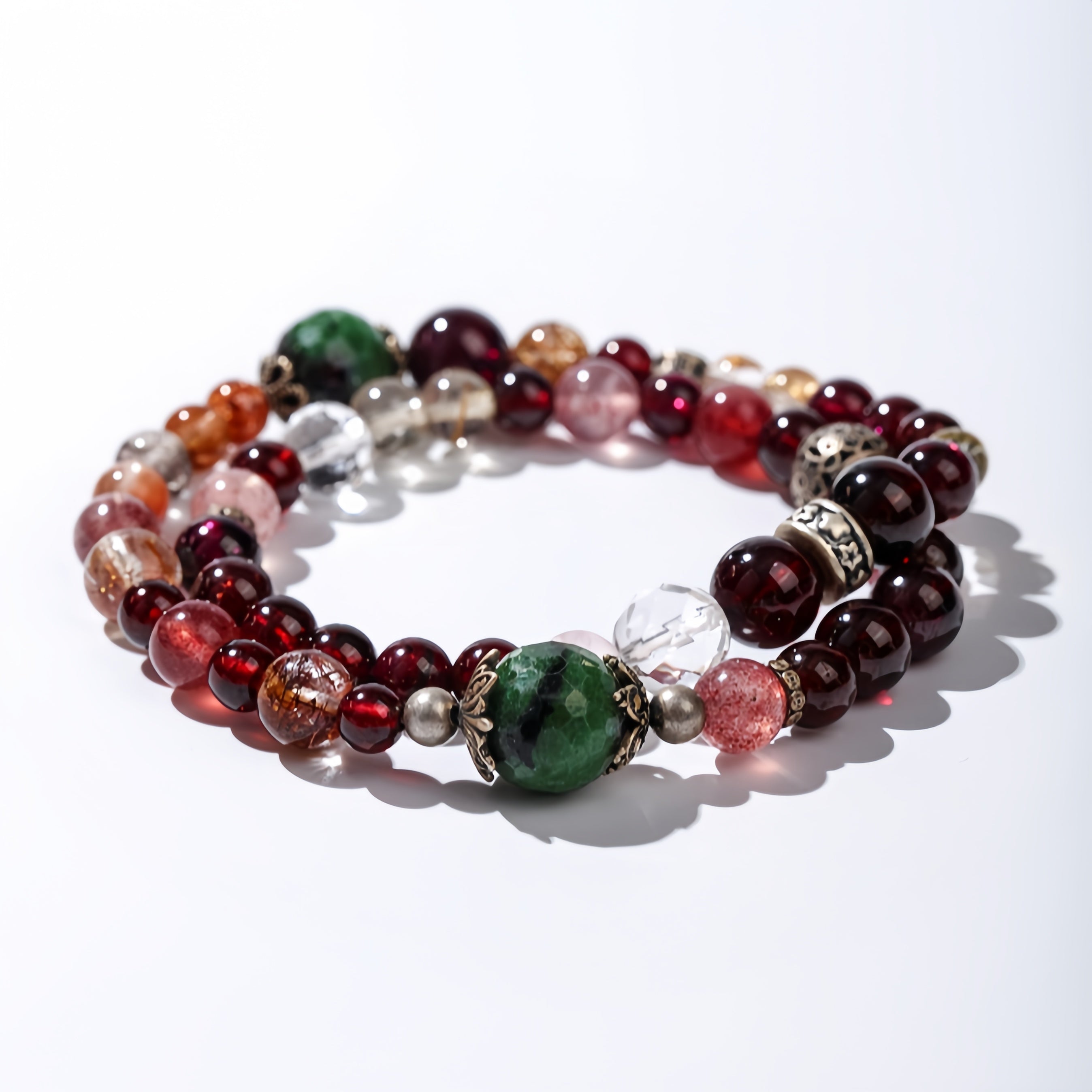 this bracelet brings together the powerful harmony of Garnet, Strawberry Quartz, Rutilated Quartz, Jade, Rose Quartz, and more.