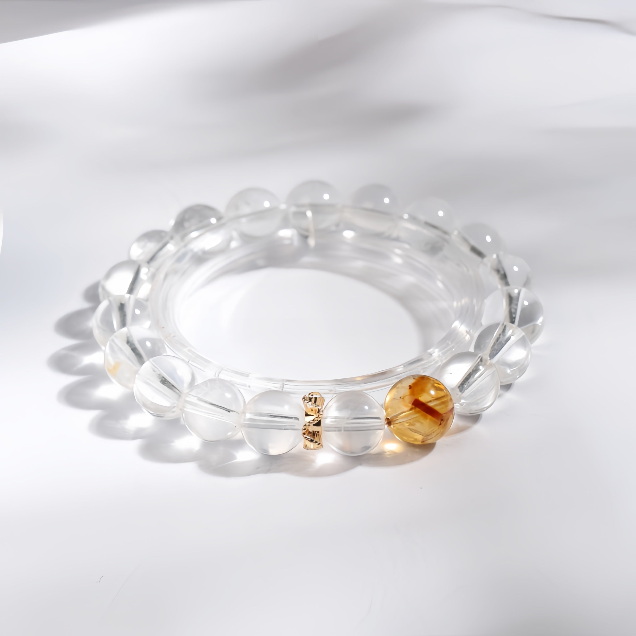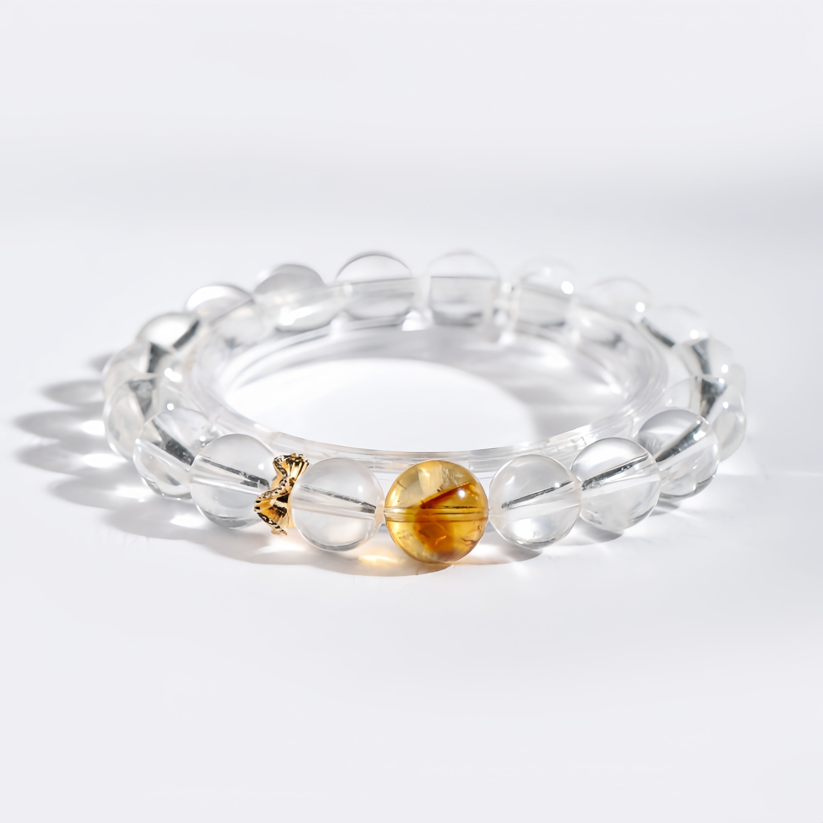 This bracelet features pristine Clear Quartz as the base, enhanced by a striking Citrine Tower Bead at its heart.