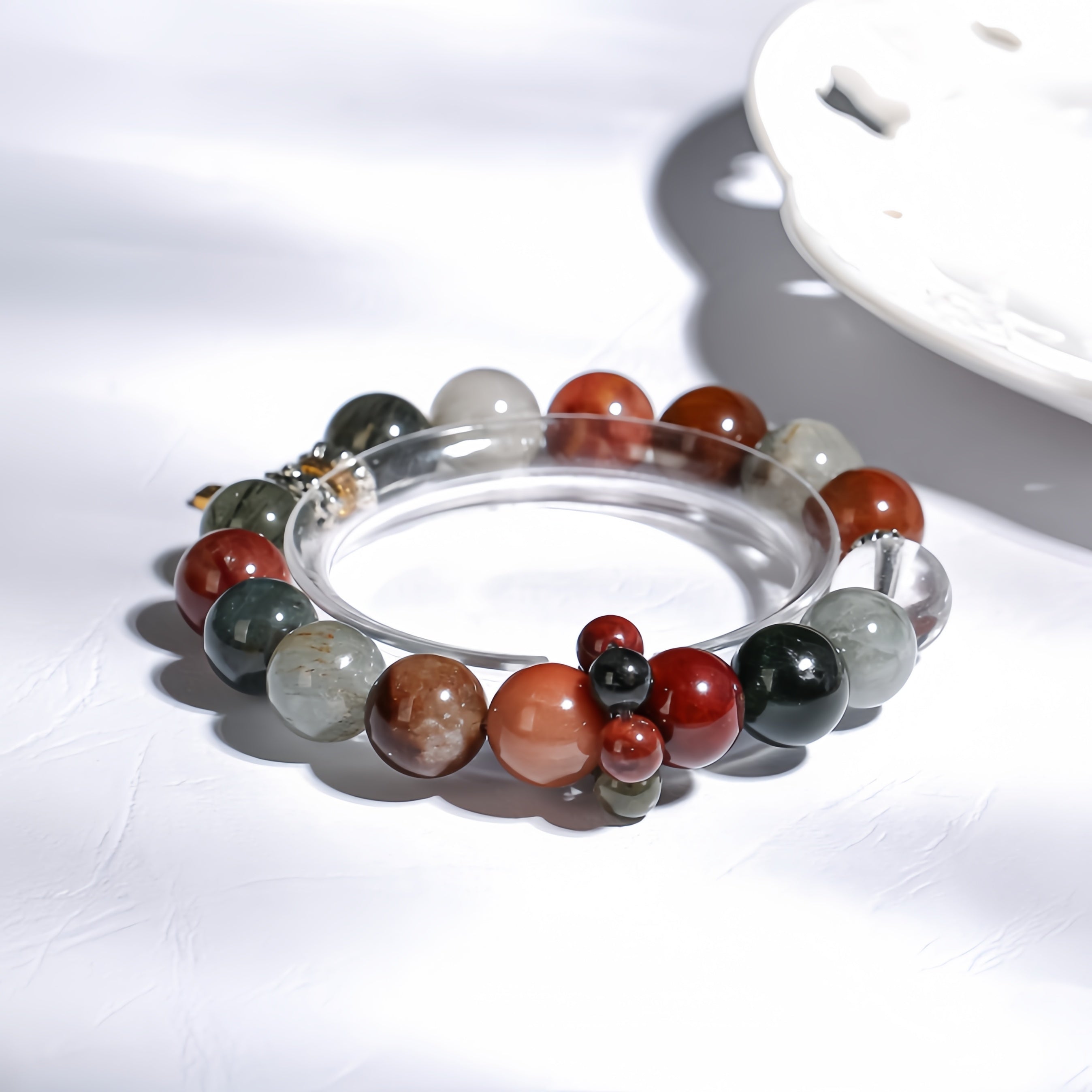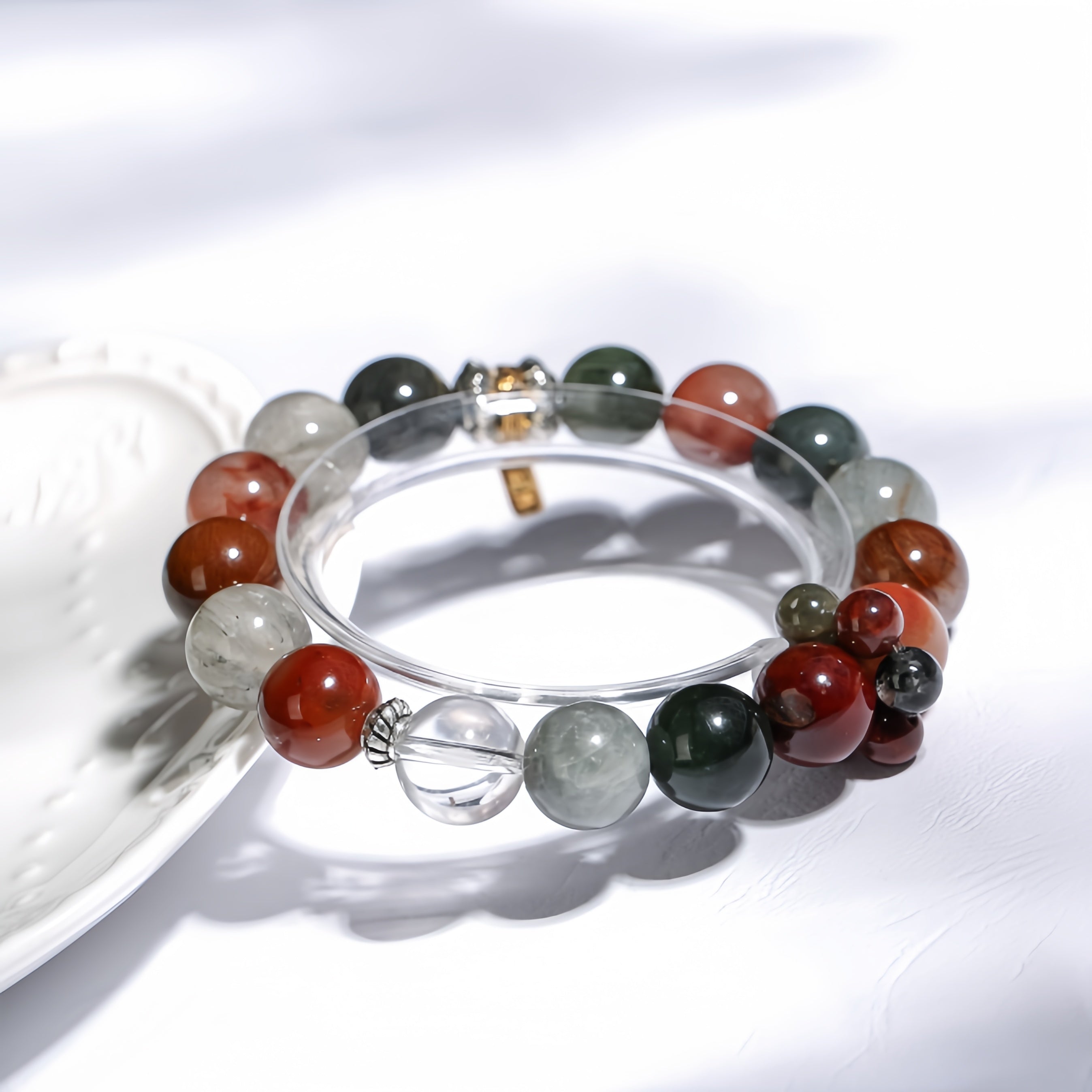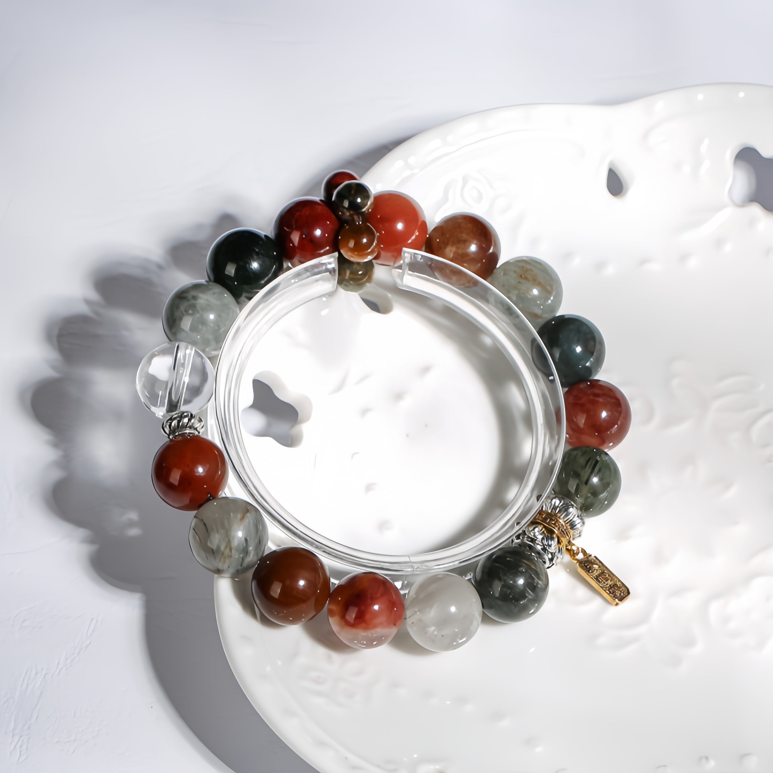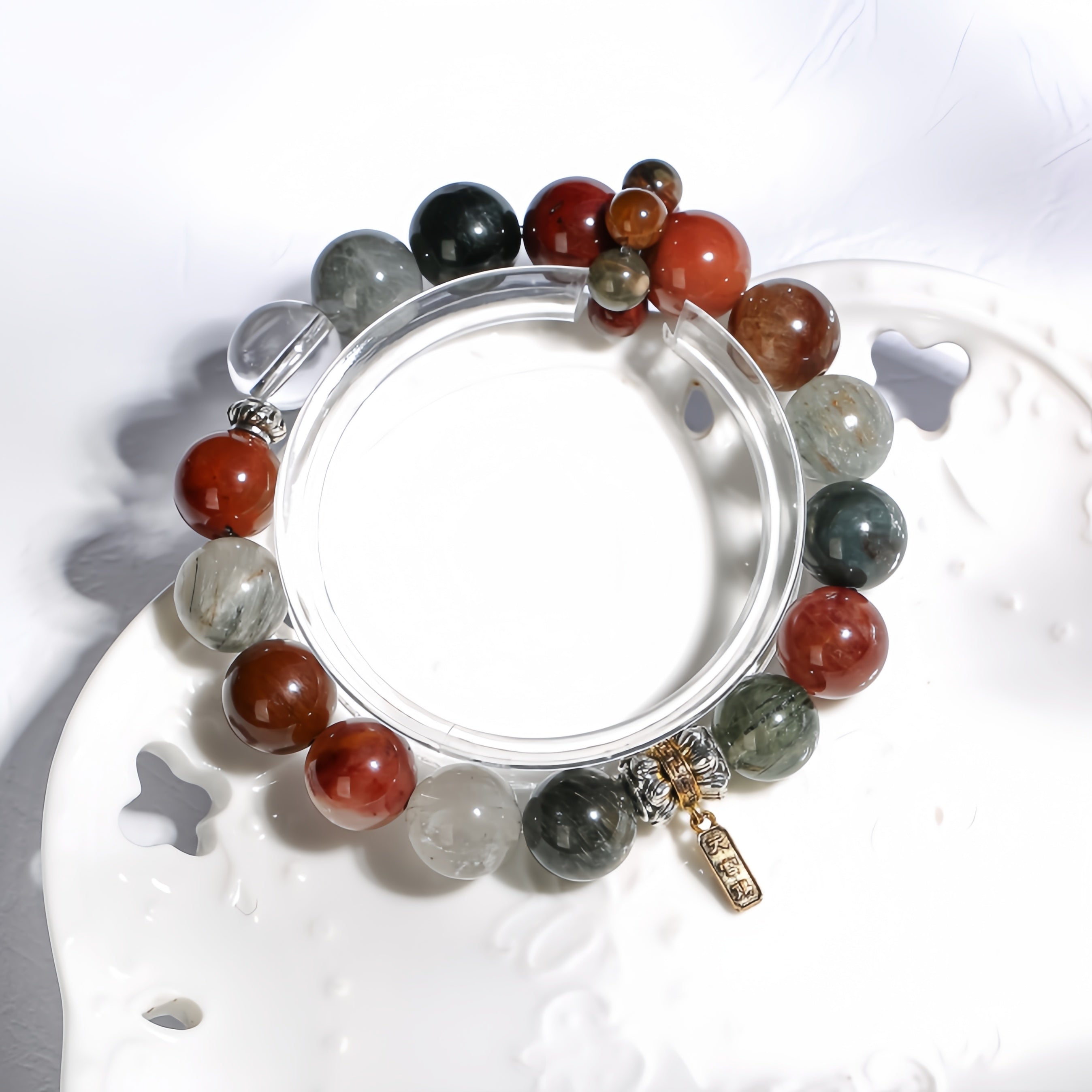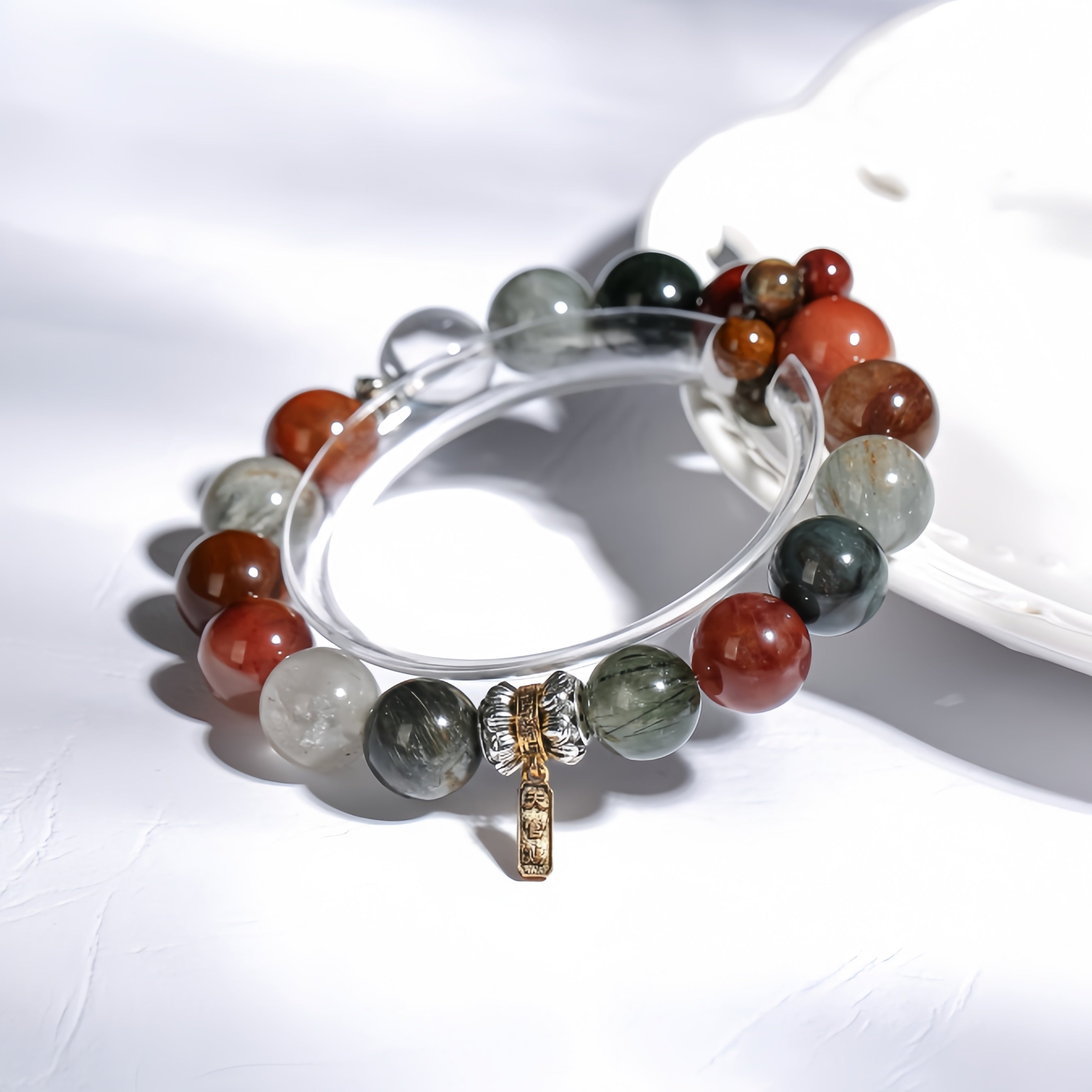 This bracelet features a central piece of Colorful Rabbit Fur, complemented by green agate, red agate, and other natural crystals. The bracelet also includes a golden barrel accessory and the “Tian Guan Ci Fu” pendant, symbolizing prosperity and blessings. The natural energy of Colorful Rabbit Fur helps enhance confidence and stabilize emotions, while the golden barrel represents the flow of wealth and abundance. The “Tian Guan Ci Fu” pendant is a symbol of happiness, good fortune, and divine protection. Every gemstone in this bracelet provides a unique energy, offering powerful protection and bringing fortune, prosperity, and inner balance.