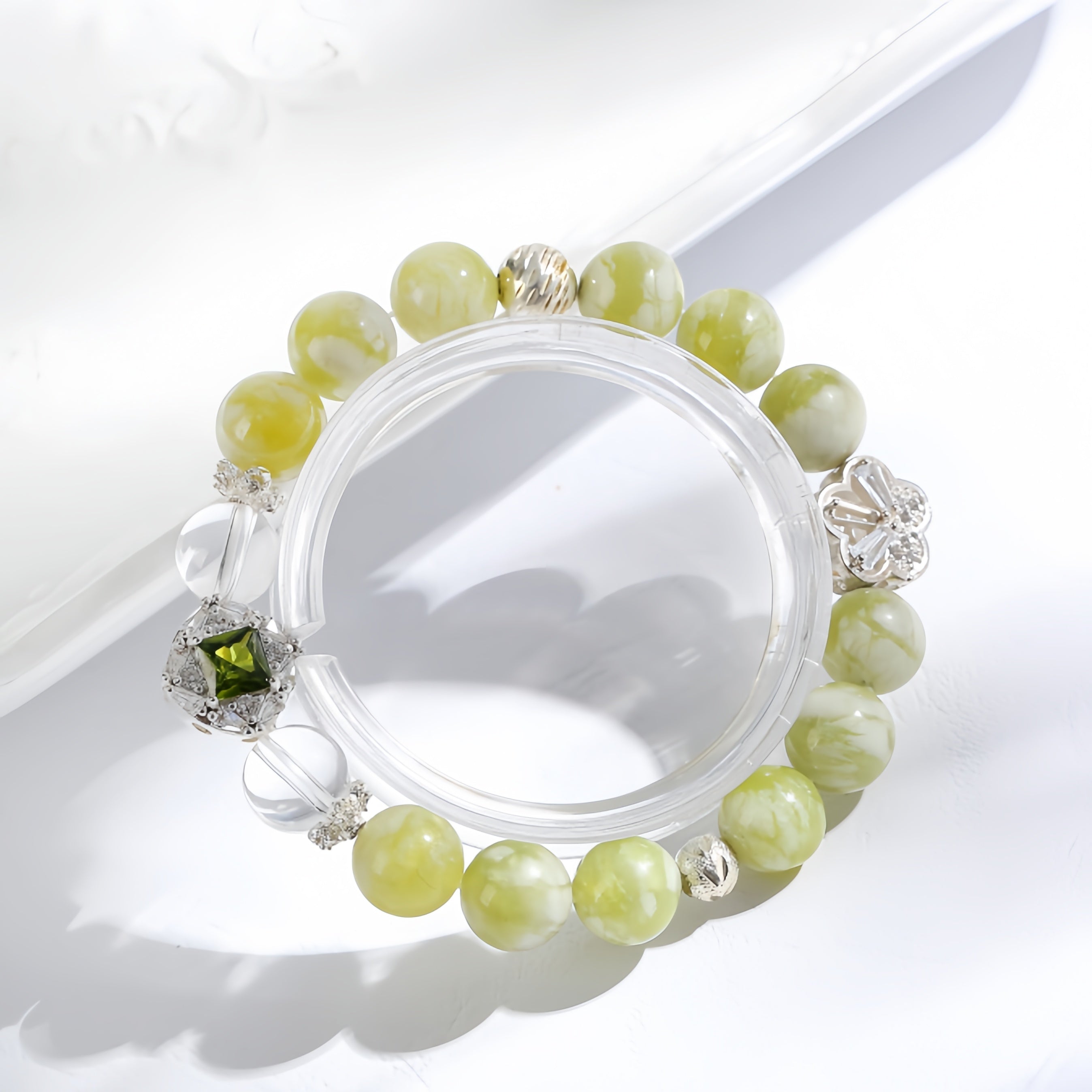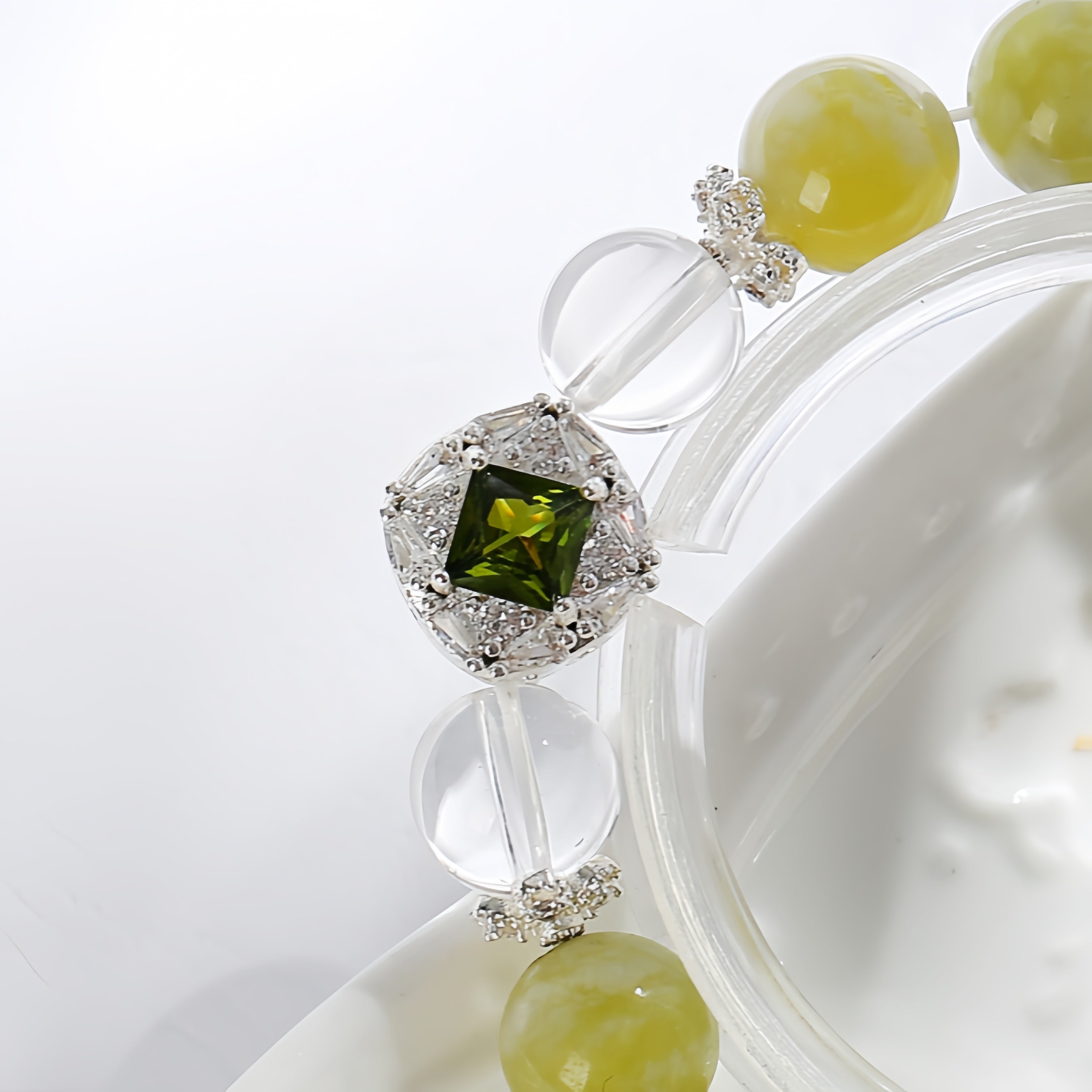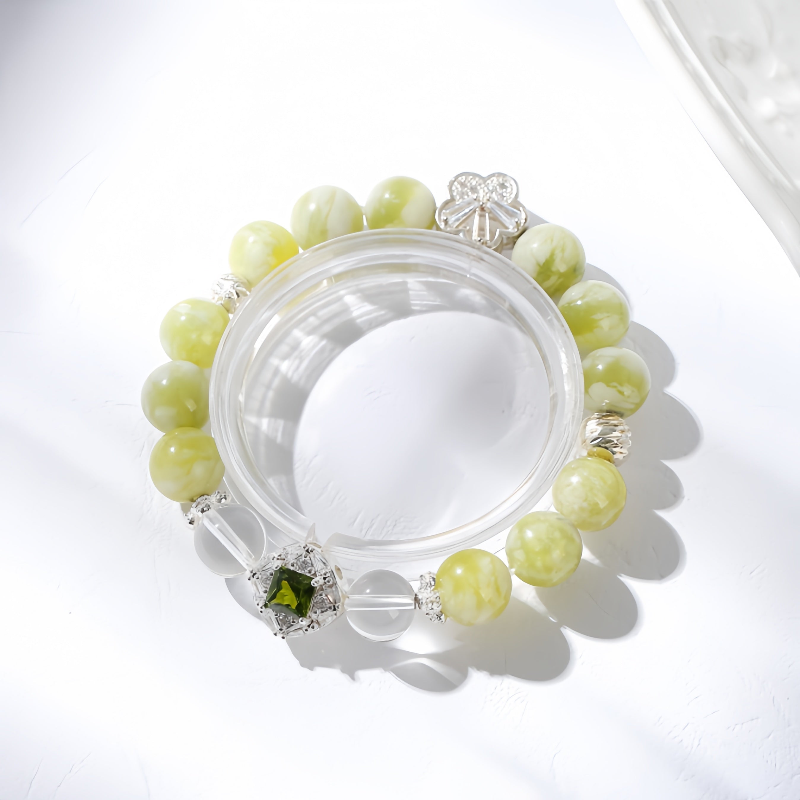 This bracelet features the soft, refreshing Xiuyu “Green Grape Cream” as the main stone, paired with pure and luminous Clear Quartz. Xiuyu gently eases stress and anxiety, promoting inner calm and harmony, while Clear Quartz, known as the “master healer,” cleanses negative energy and amplifies positive vibrations. A perfect accessory for daily wear, it brings you serenity and balanced energy throughout the day.