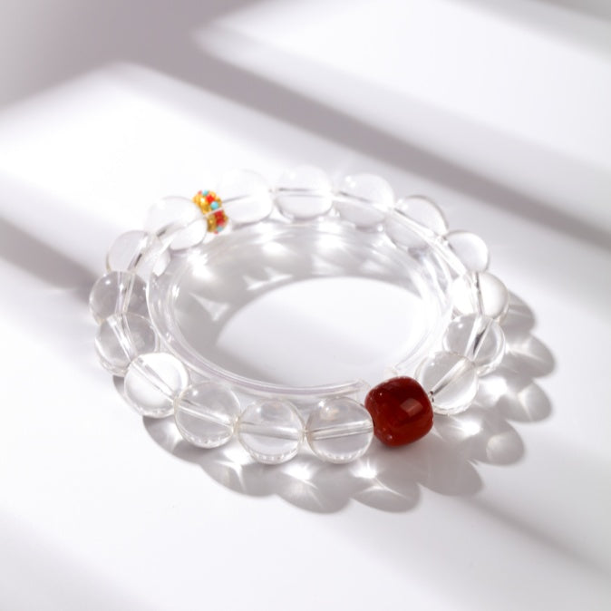 This bracelet wraps a glowing red agate bead in circles of pure clear quartz — a symbol of calm strength and inner fire. The multicolor spacer adds a subtle charm, like a quiet celebration of life’s vibrance and resilience.