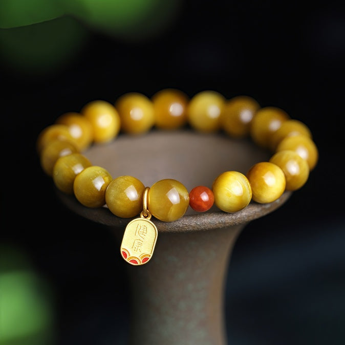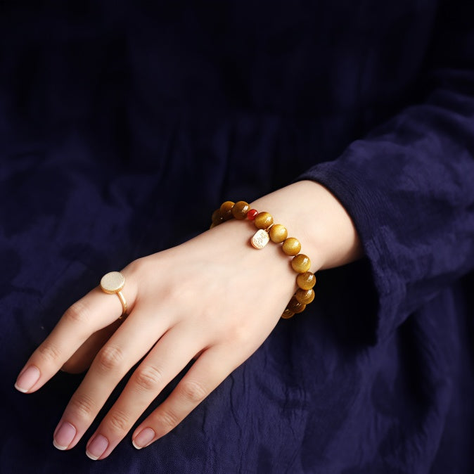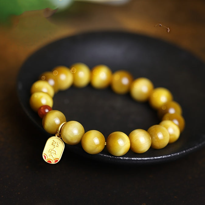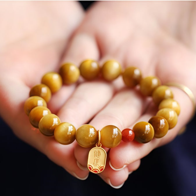 This bracelet is crafted from golden Tiger’s Eye, a stone symbolizing courage, vitality, and clarity. Its luminous sheen resembles a cat’s eye, paired with South Red Agate and a gold charm engraved with “Health” and “Peace” in Chinese—perfect for warding off negative energy and bringing safety, especially during your zodiac year (Ben Ming Nian). A meaningful gift for personal protection or for blessing loved ones with good fortune.