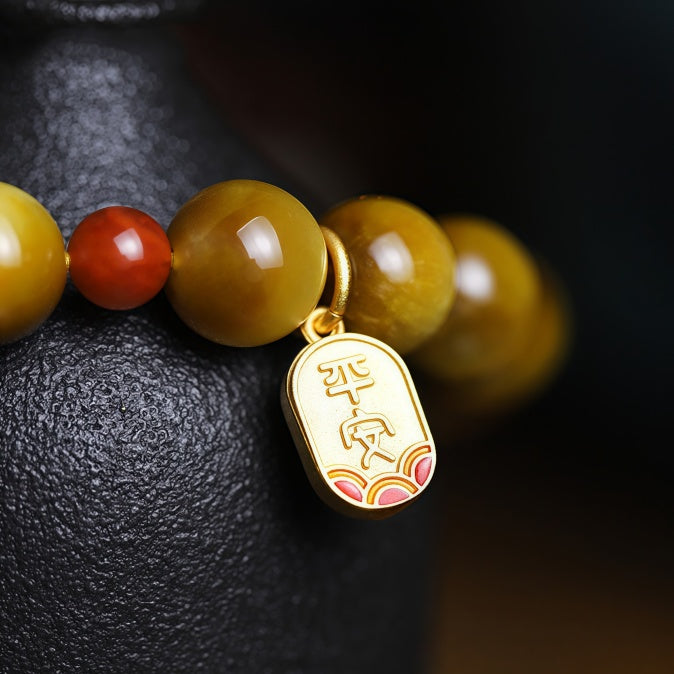 Golden Tiger’s Eye, South Red Agate, Metal Charm (engraved with “Health” & “Peace”)