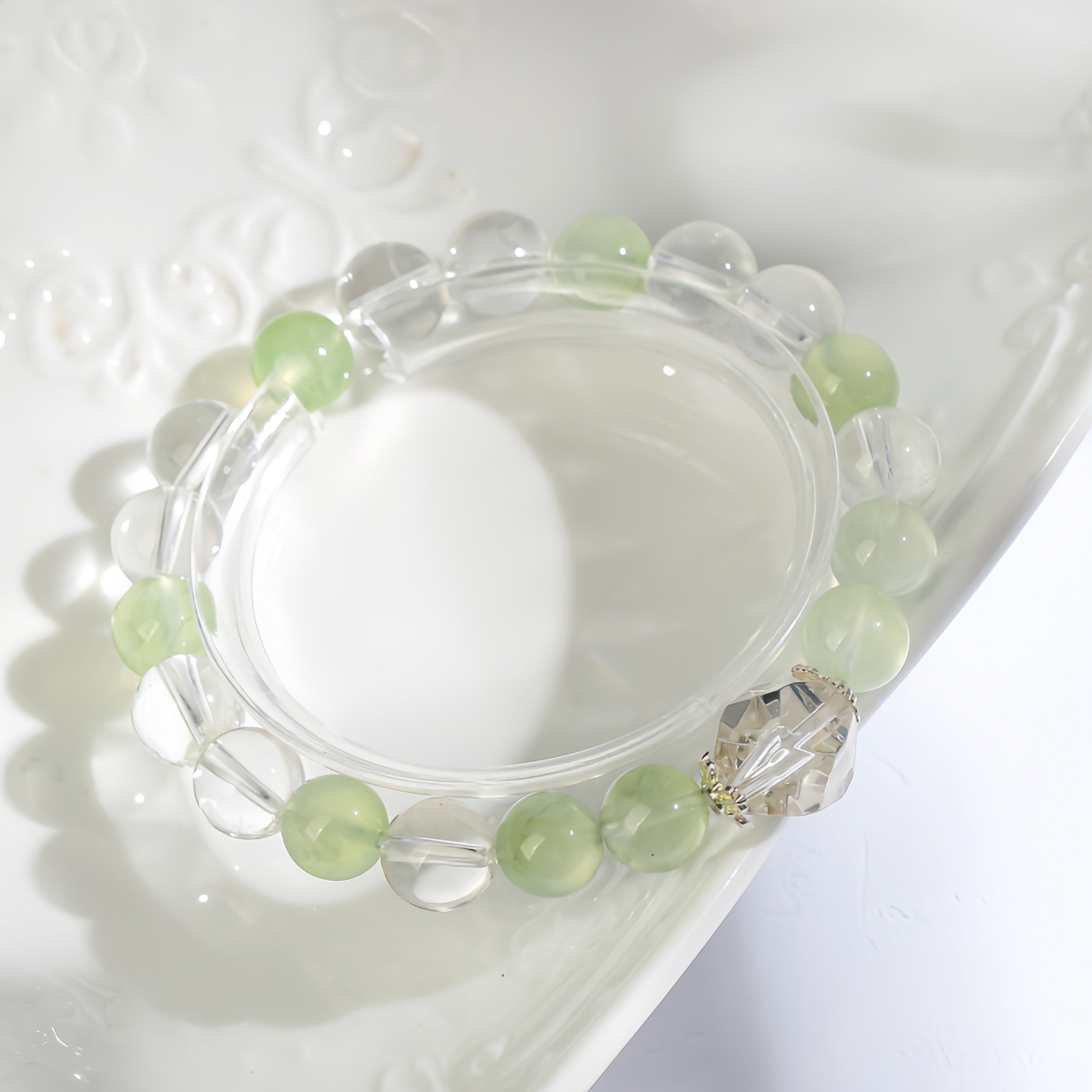 Like the soft glow of morning sunlight, this bracelet pairs luminous Clear Quartz with soothing Prehnite beads, centered by a faceted clear crystal. Clear Quartz is a master purifier, known to cleanse the aura and enhance mental focus. Prehnite is associated with peace, renewal, and emotional healing. Elegant and gentle, it’s the perfect companion for everyday clarity and calm.