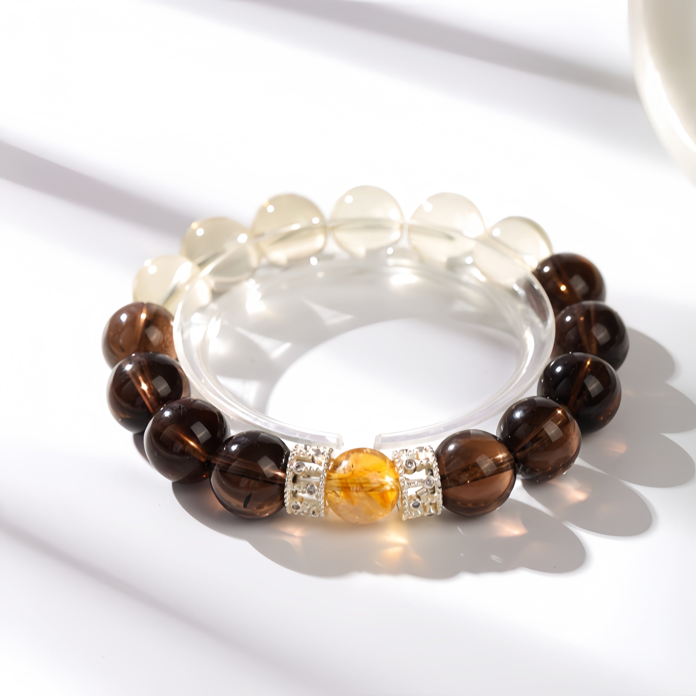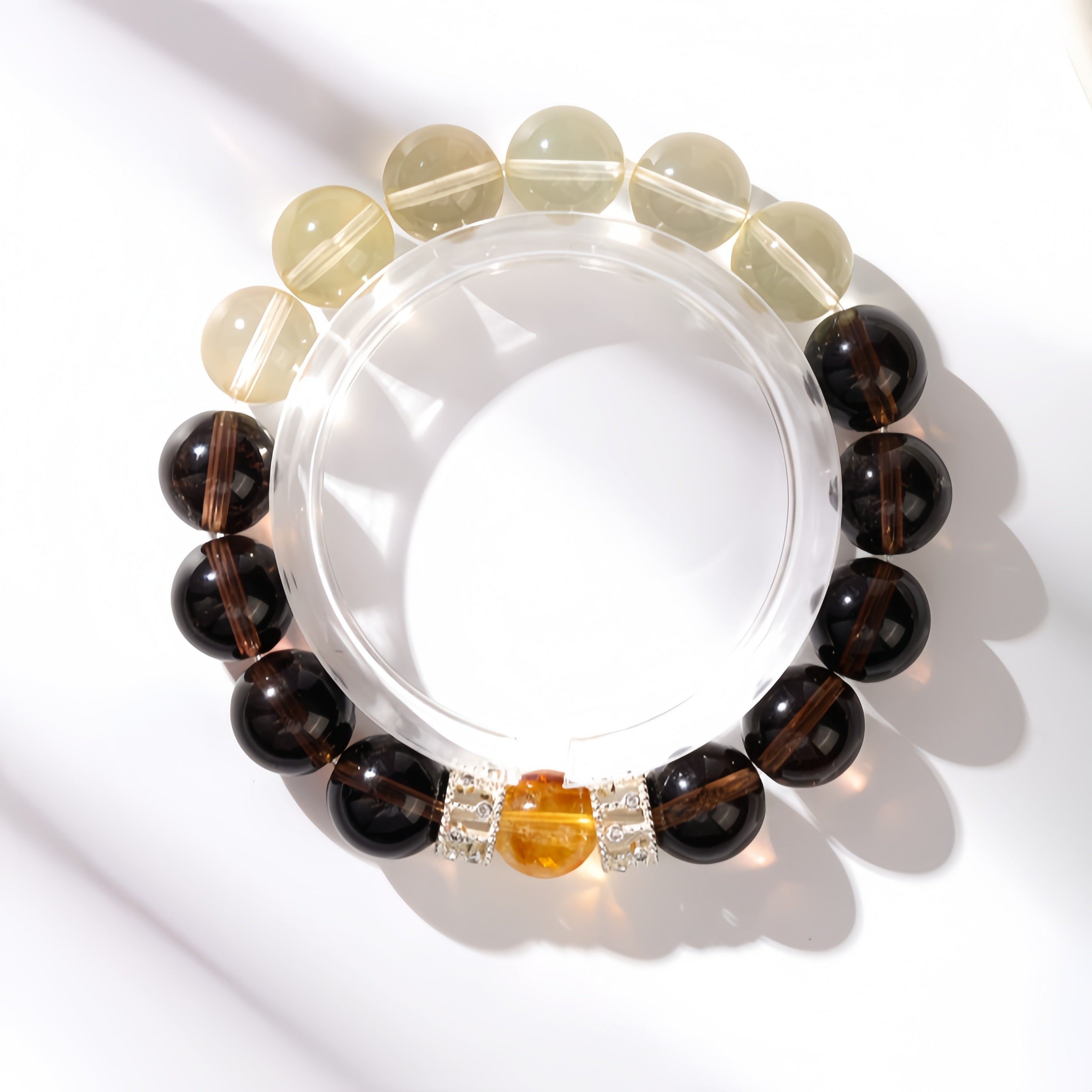 Smoky Quartz calms and grounds your energy, while Citrine ignites self-confidence and prosperity. At the center stands a Yellow Tower Crystal — a golden beacon of growth and progress. Let this bracelet be your symbol of steady advancement and abundant fortune in your professional journey.