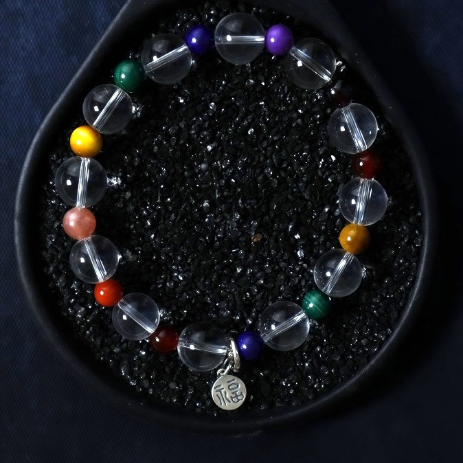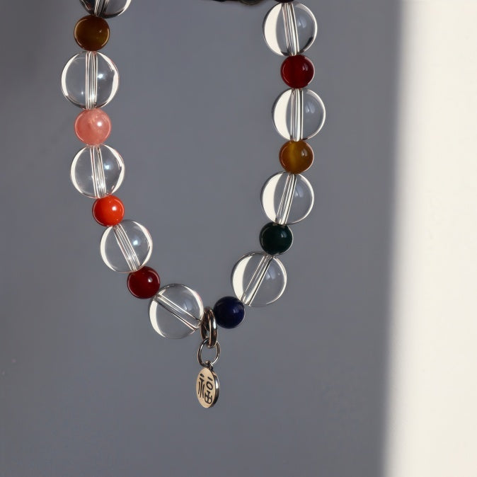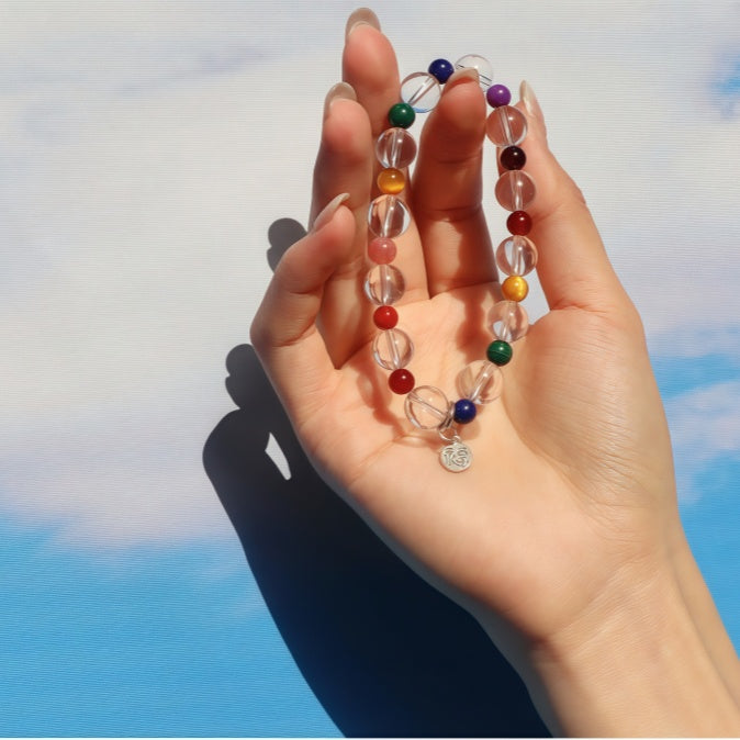 This bracelet features luminous clear quartz beads paired with seven vibrant gemstones, each symbolizing a chakra’s unique energetic vibration. Clear quartz, known as the “Master Amplifier,” enhances energy clarity and emotional purification. The added stones—Rhodochrosite, South Red Agate, Malachite, Golden Tiger’s Eye, Lapis Lazuli, Lepidolite, and Garnet—support emotional healing, heart-centered connection, confidence, and spiritual awareness. A radiant tool for energy balancing, chakra alignment, and mindful living.