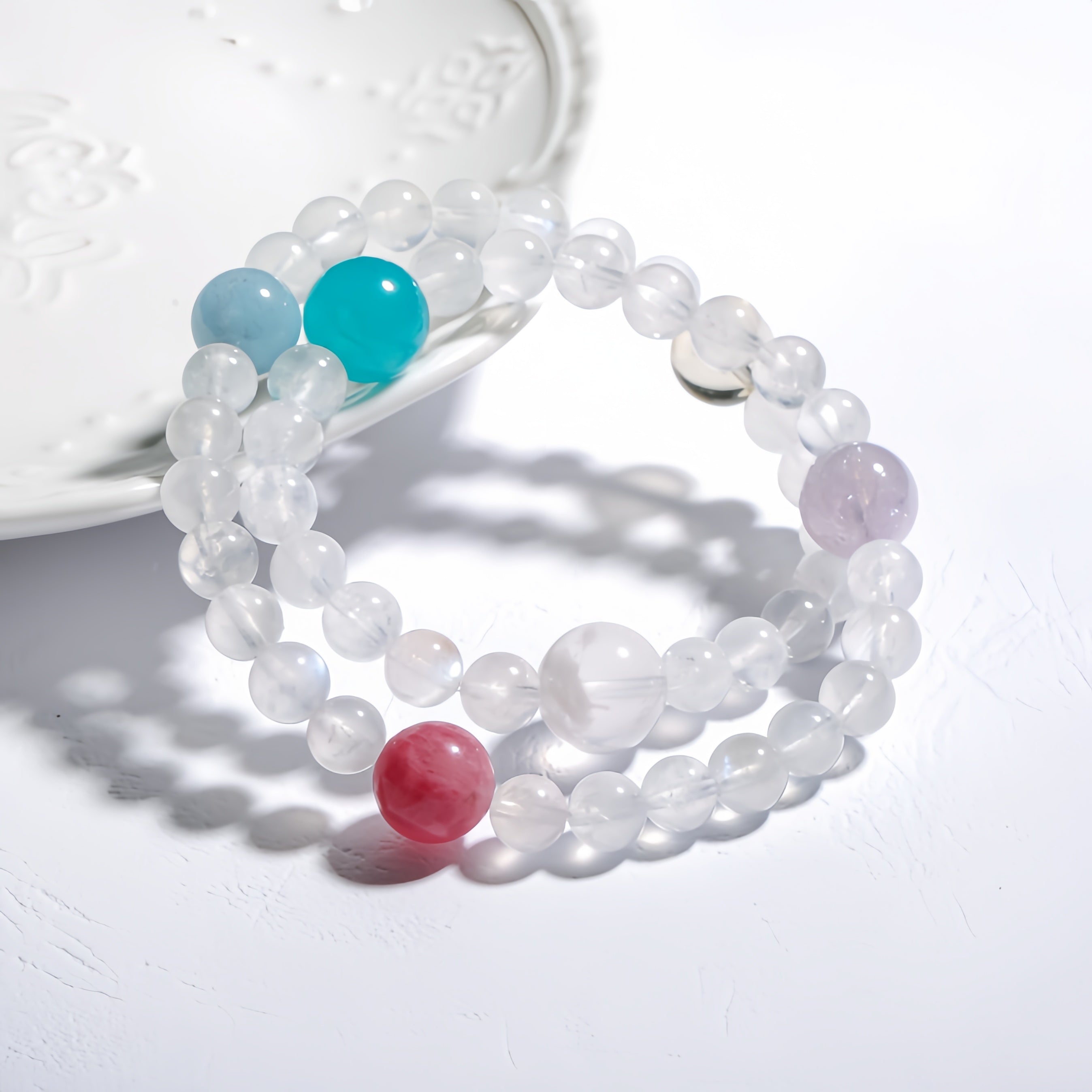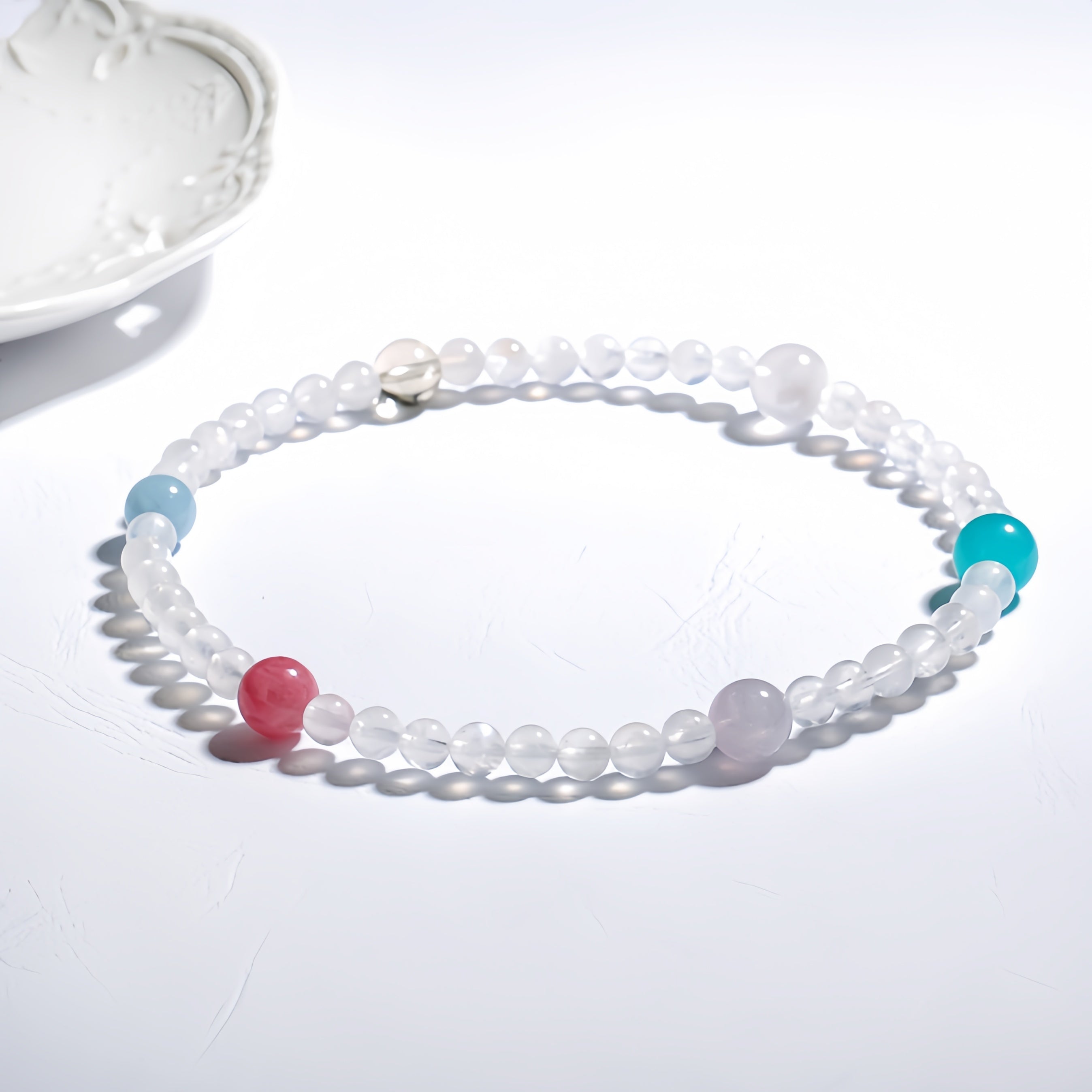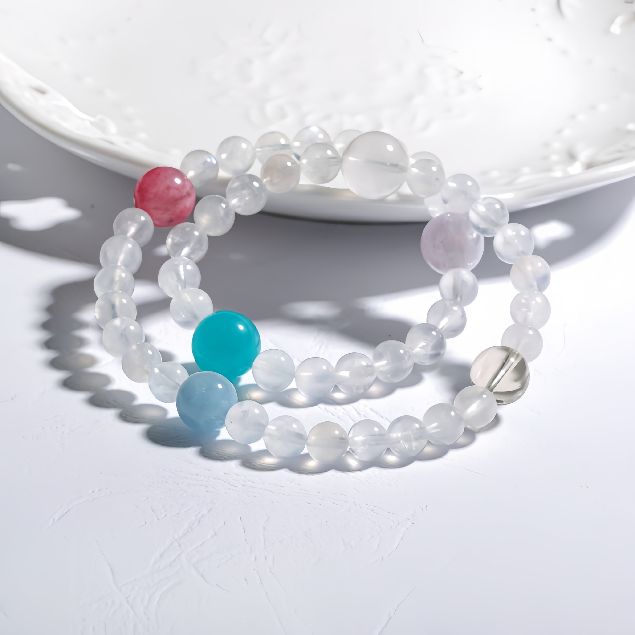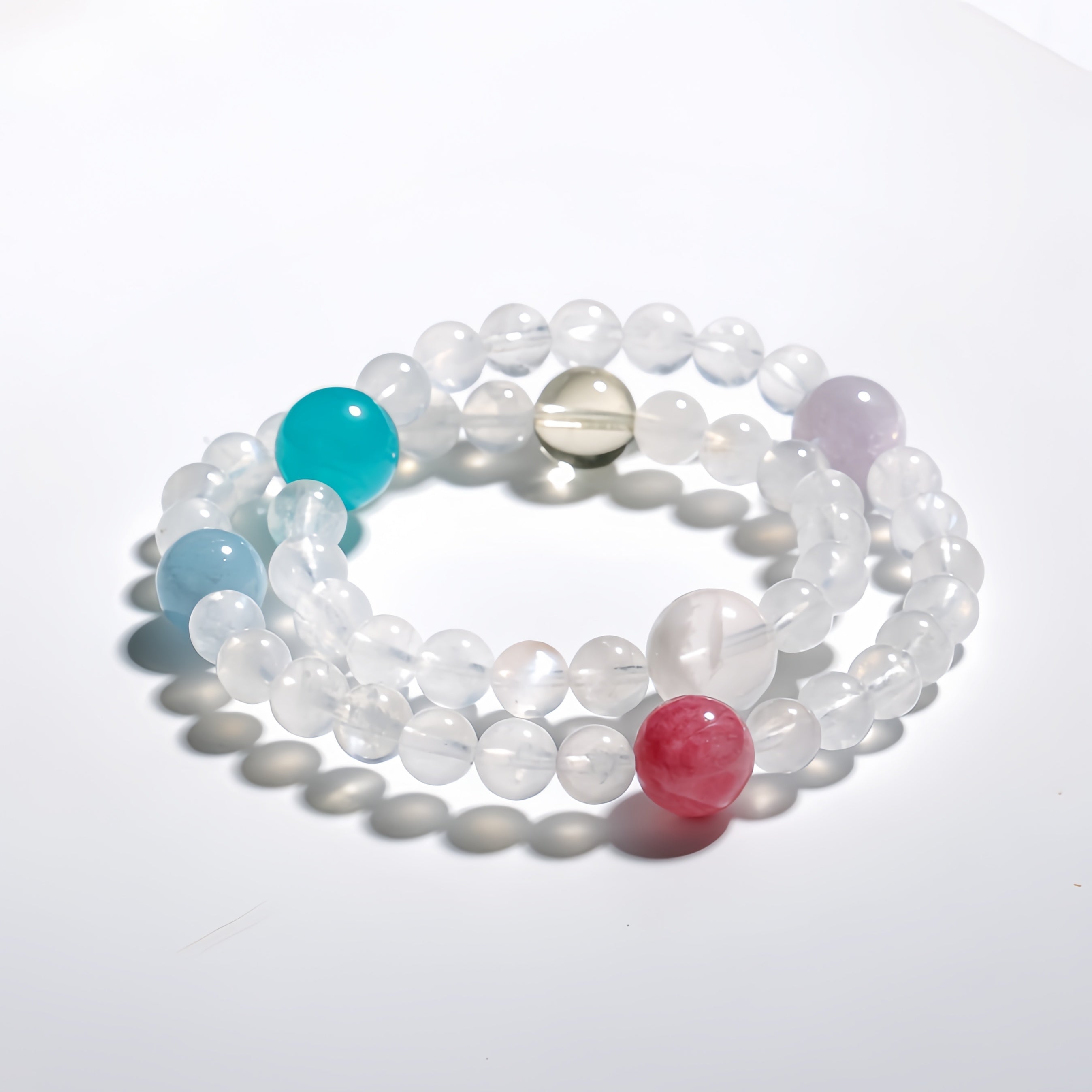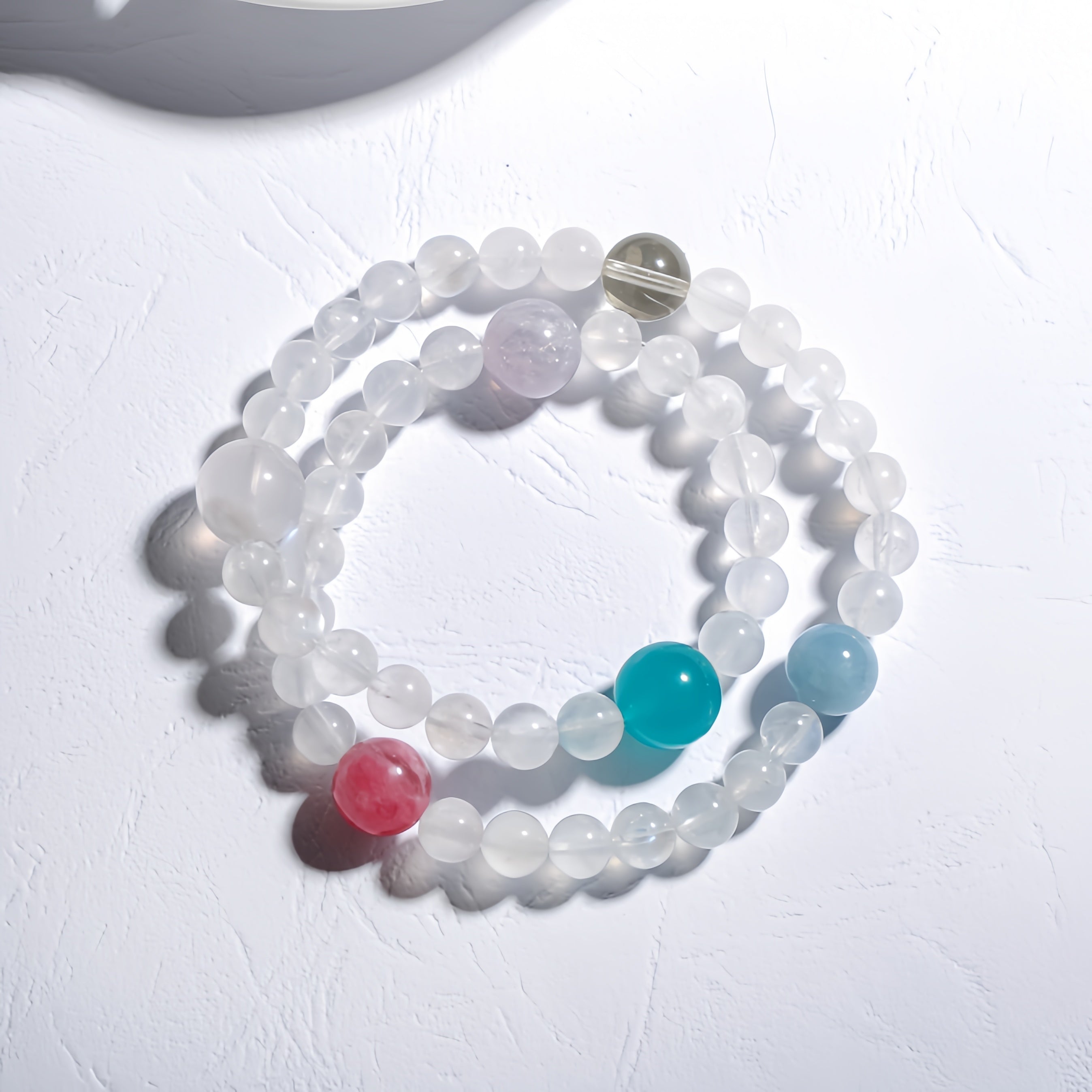 This Summer Fresh Multigem Double Circle Bracelet is made with Clear Quartz as the primary material, paired with Aquamarine, Malachite, Smoky Quartz, and Cherry Blossom Rain, offering a vibrant and refreshing design that evokes a light, breezy summer feel. Clear Quartz purifies and amplifies energy, helping to clear negative energy and enhance the overall energy field; Aquamarine brings calmness and clarity, soothing emotions and enhancing communication; Malachite symbolizes good fortune and prosperity, boosting personal energy and luck; Smoky Quartz clears negative energy, promoting overall energy flow; and Cherry Blossom Rain represents love and harmony, with its gentle pink tones offering emotional healing and balance. The double-circle design adds a modern touch, and wearing this bracelet feels like being immersed in a fresh summer breeze, nourishing both your body and soul.