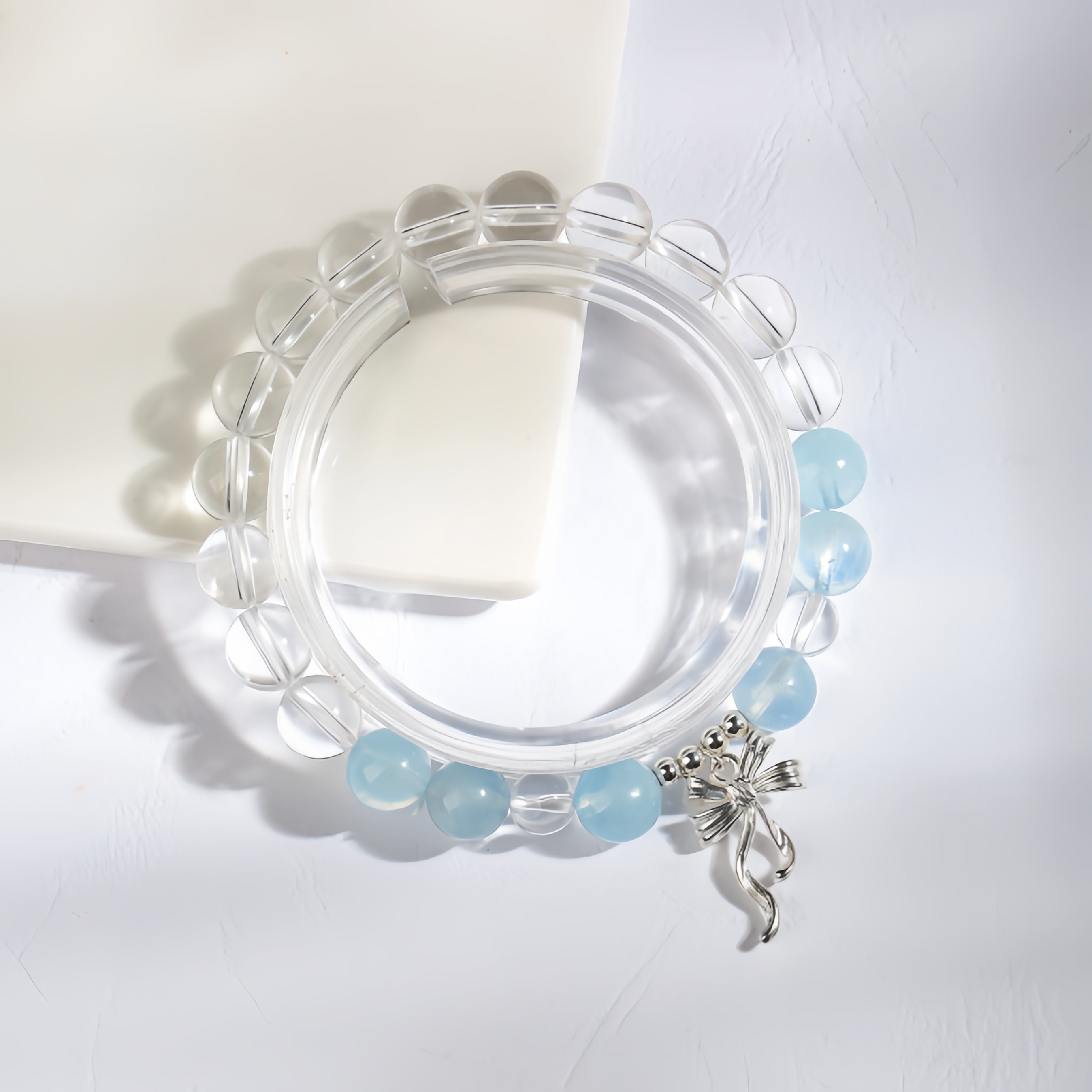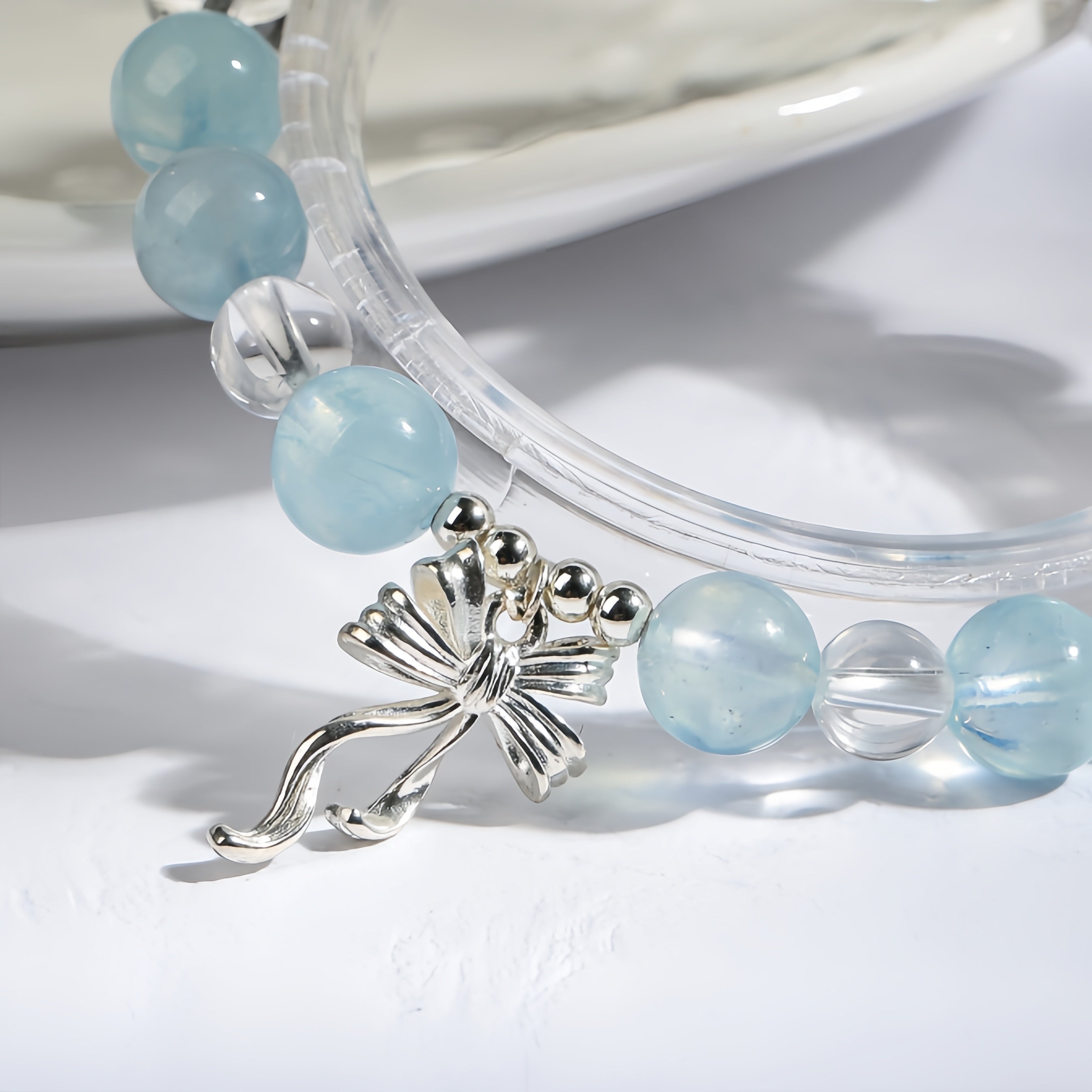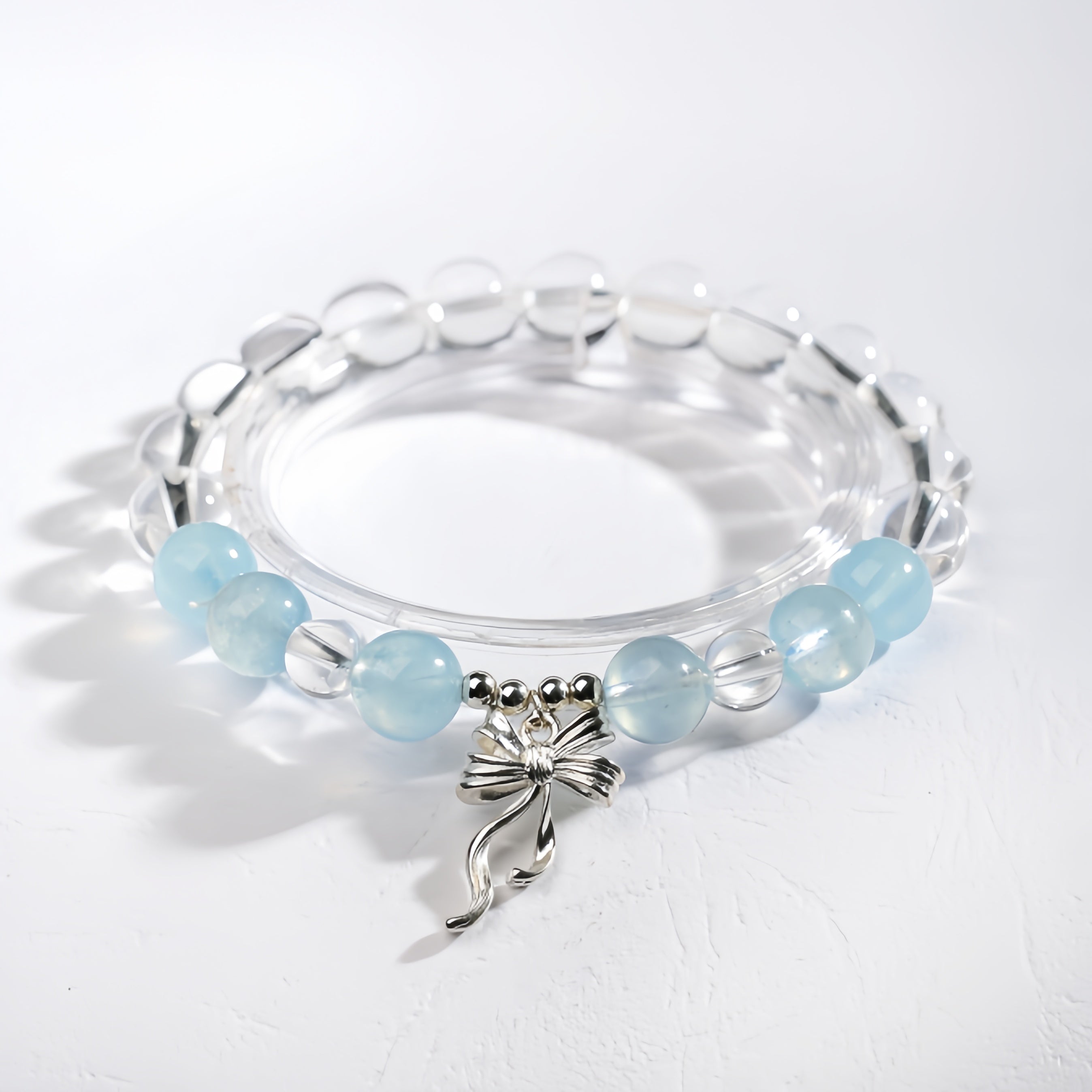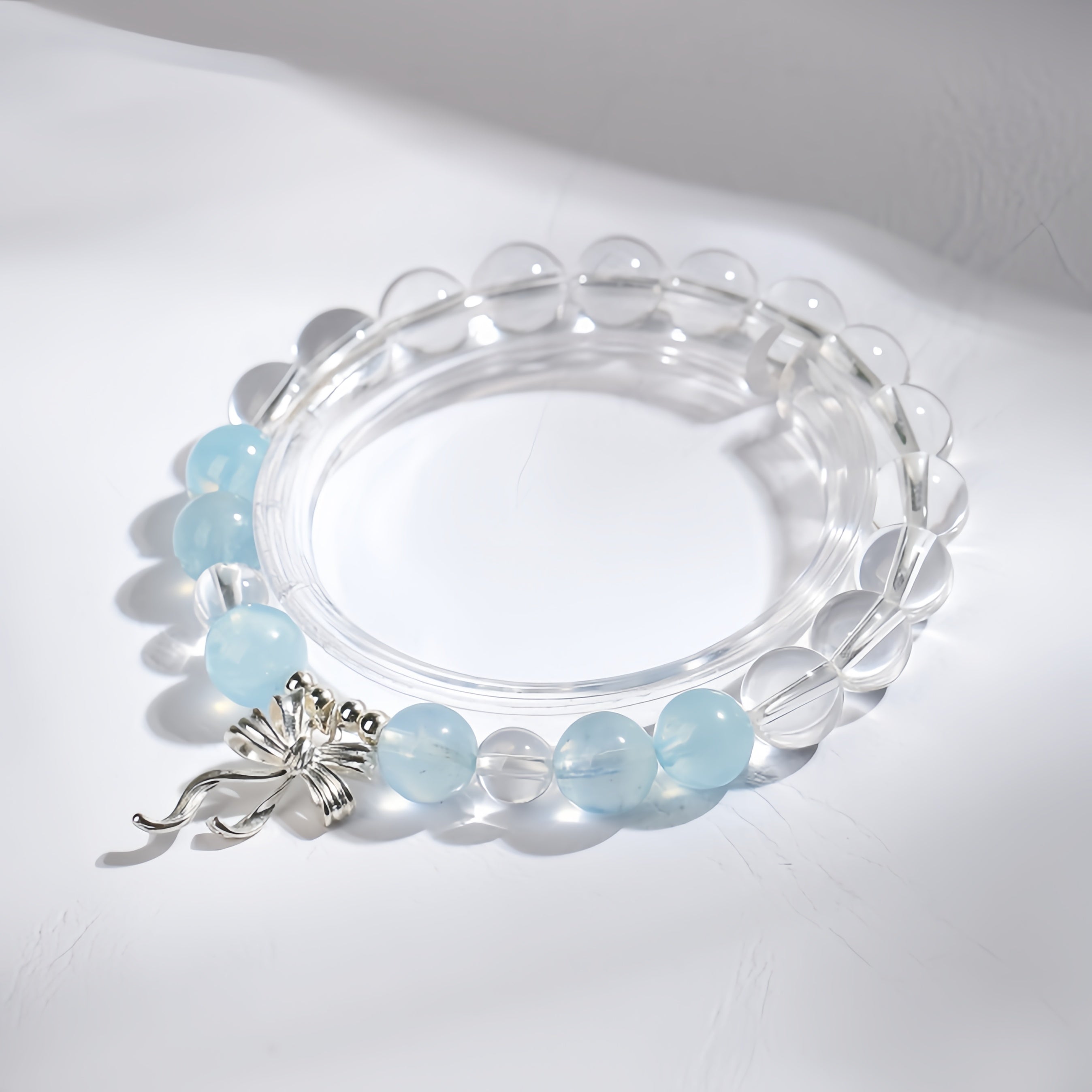 Made with radiant Clear Quartz and tranquil Aquamarine, this bracelet reflects the serenity of sunlight over ocean waves. The silver bow charm adds a soft, elegant flair — like a sea breeze tied gently around your wrist.