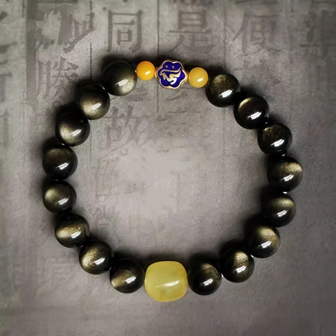 This bracelet features shimmering Black Gold Obsidian beads, renowned for their strong protective power against negativity and bad luck. At its center, a Yellow Jade stone represents stability, prosperity, and inner confidence. The design is completed with a hand-painted enamel zodiac charm (customizable with all 12 zodiac animals), making it a meaningful talisman of personal guardianship and fortune.